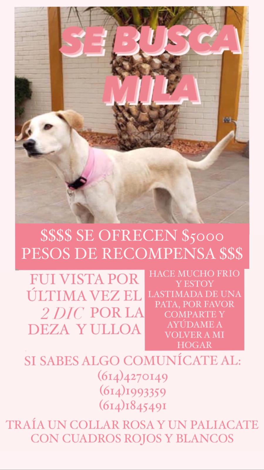 Mila traía un collar de color rosa y un paliacate con cuadros rojos y blancos al momento de su desaparición.