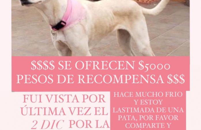 Chihuahua.- Ofrecen 5 mil pesos de recompensa por perrita extraviada, tiene problemas con una pata y debe tomar medicamentos.
