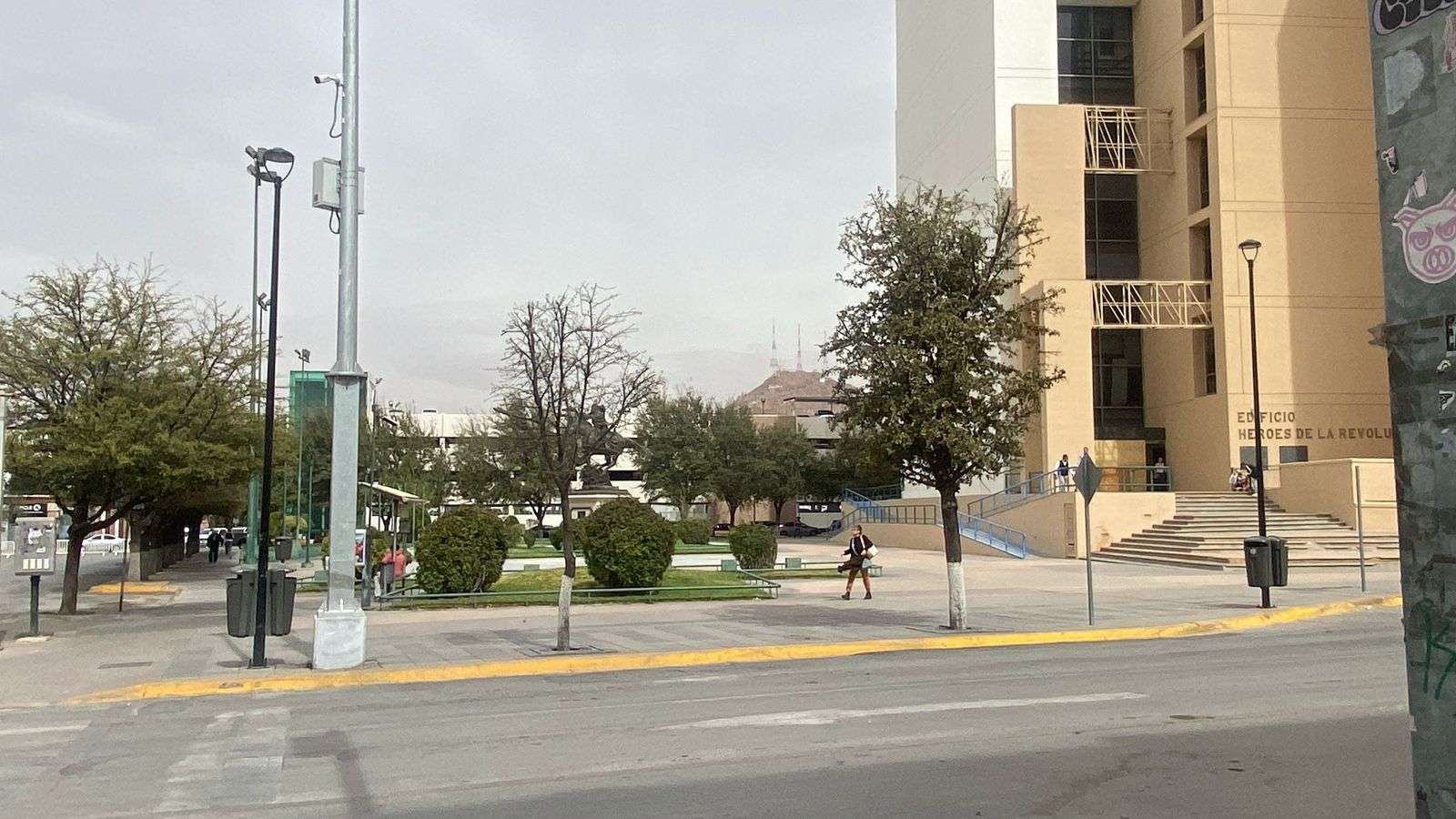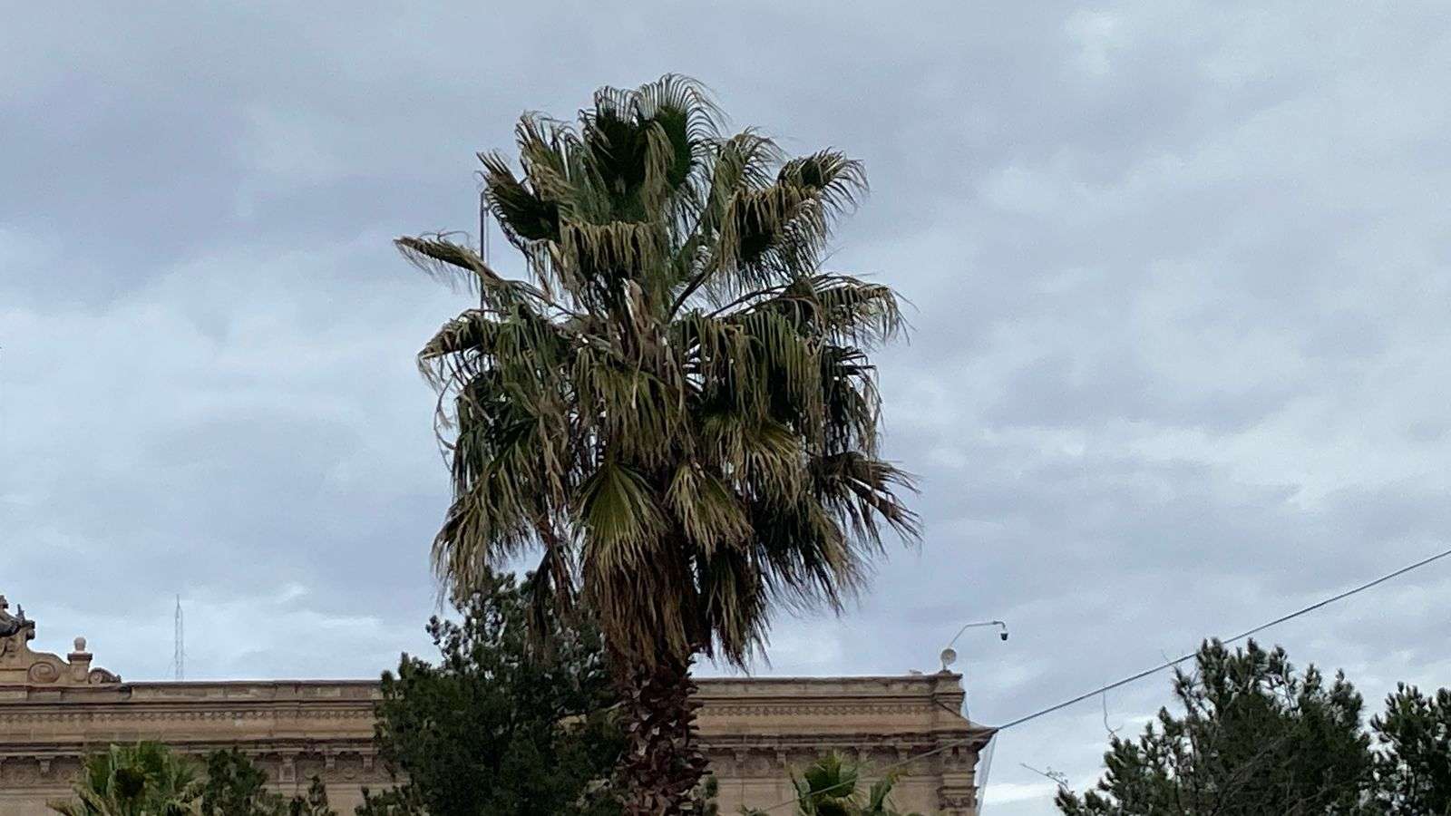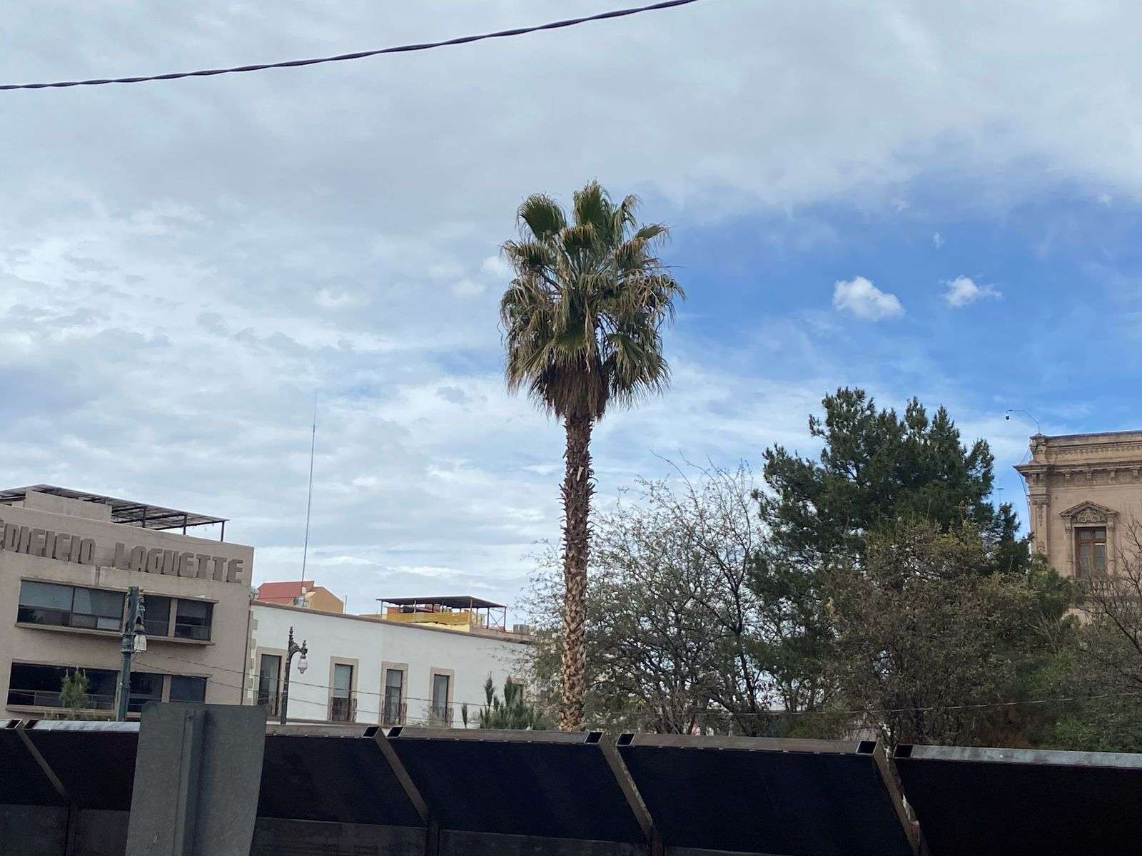 La fuerza del viento fue tan intensa que movía con gran rapidez los árboles y palmeras de la Plaza Hidalgo, mientras que los transeúntes luchaban contra la ráfaga al caminar por las calles del centro.