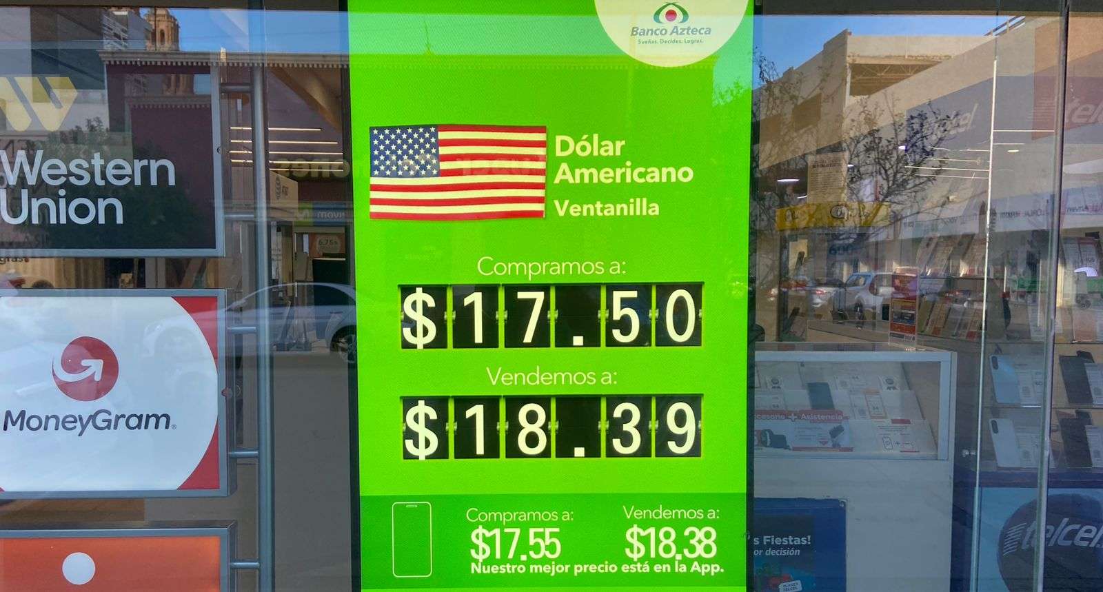 Chihuahua.– El dólar para este jueves 8 de enero bajó drásticamente a $18.39 a la venta y a $17.50 a la compra en ventanillas del Banco Azteca, ubicado en la calle Cuarta y Aldama.