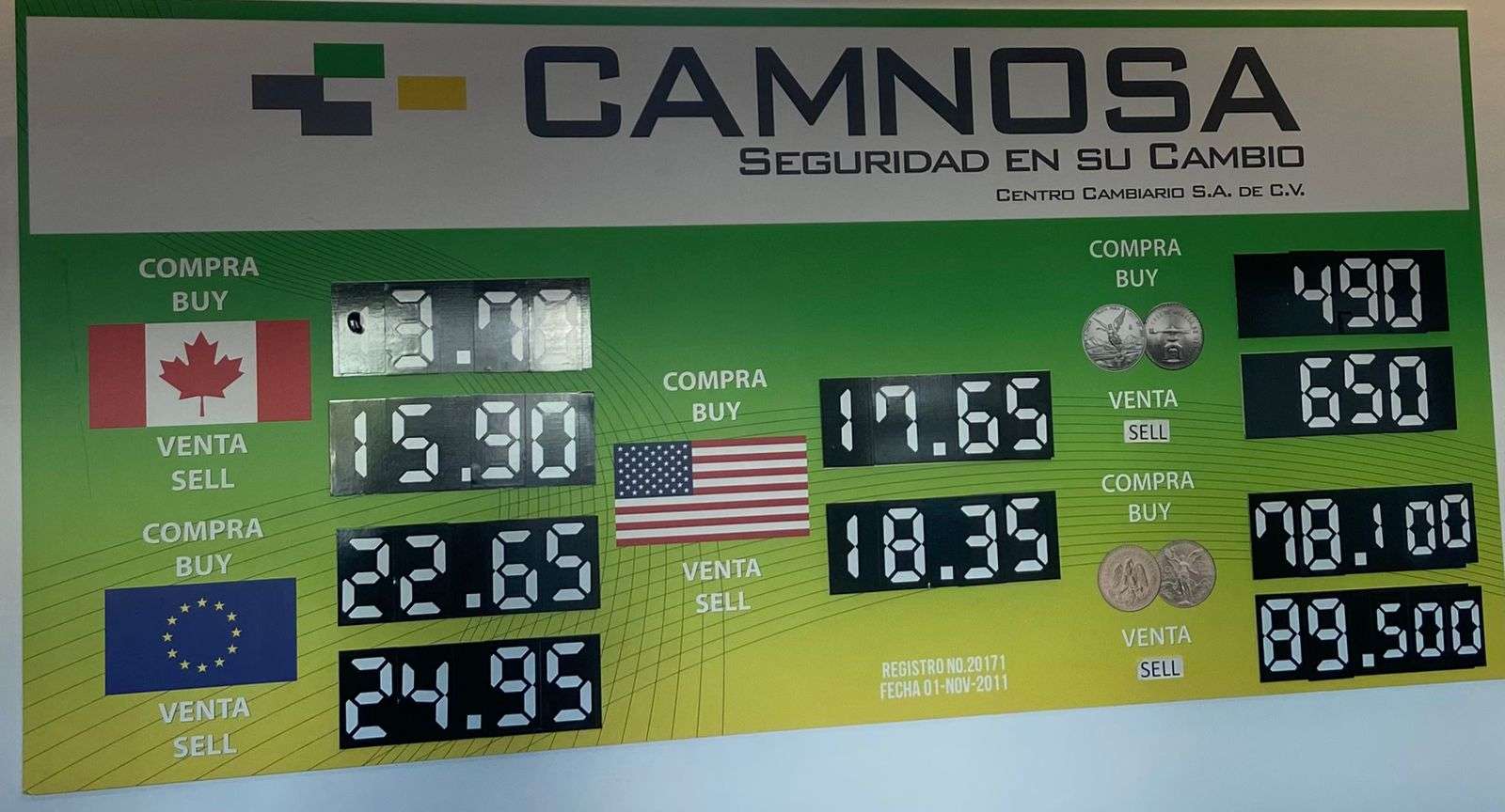 En la casa de cambio Camnosa, ubicada en la calle Aldama, casi esquina con Ocampo, el dólar estadounidense se cotizó en $18.35 a la venta y $17.65 a la compra.