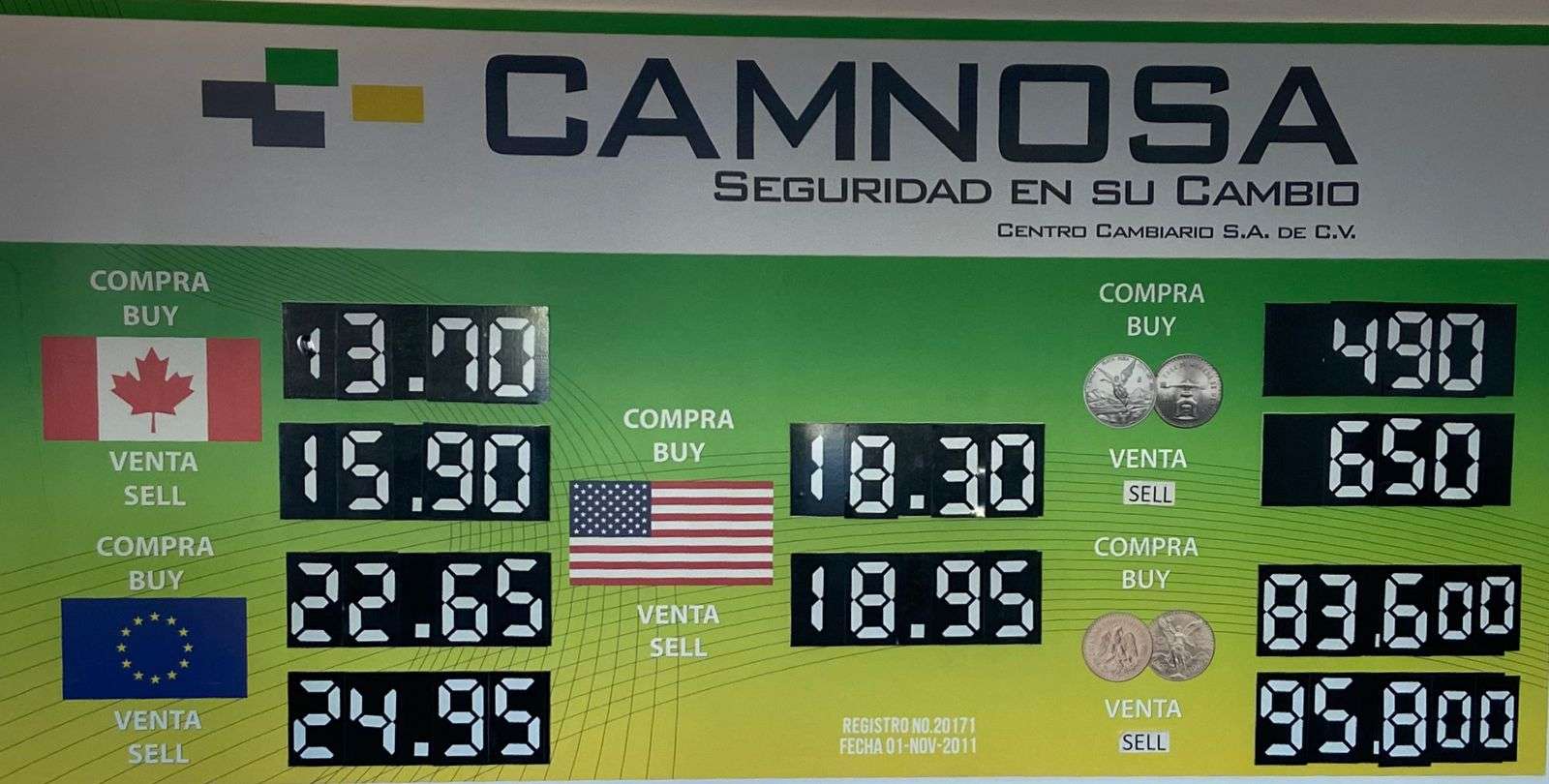 En la casa de cambio Camnosa, ubicada en la calle Aldama, casi esquina con Ocampo, el dólar estadounidense se ofreció a $18.95 a la venta y a $18.30 a la compra.