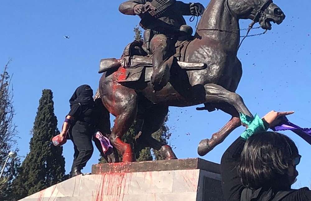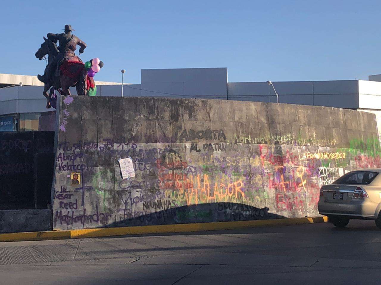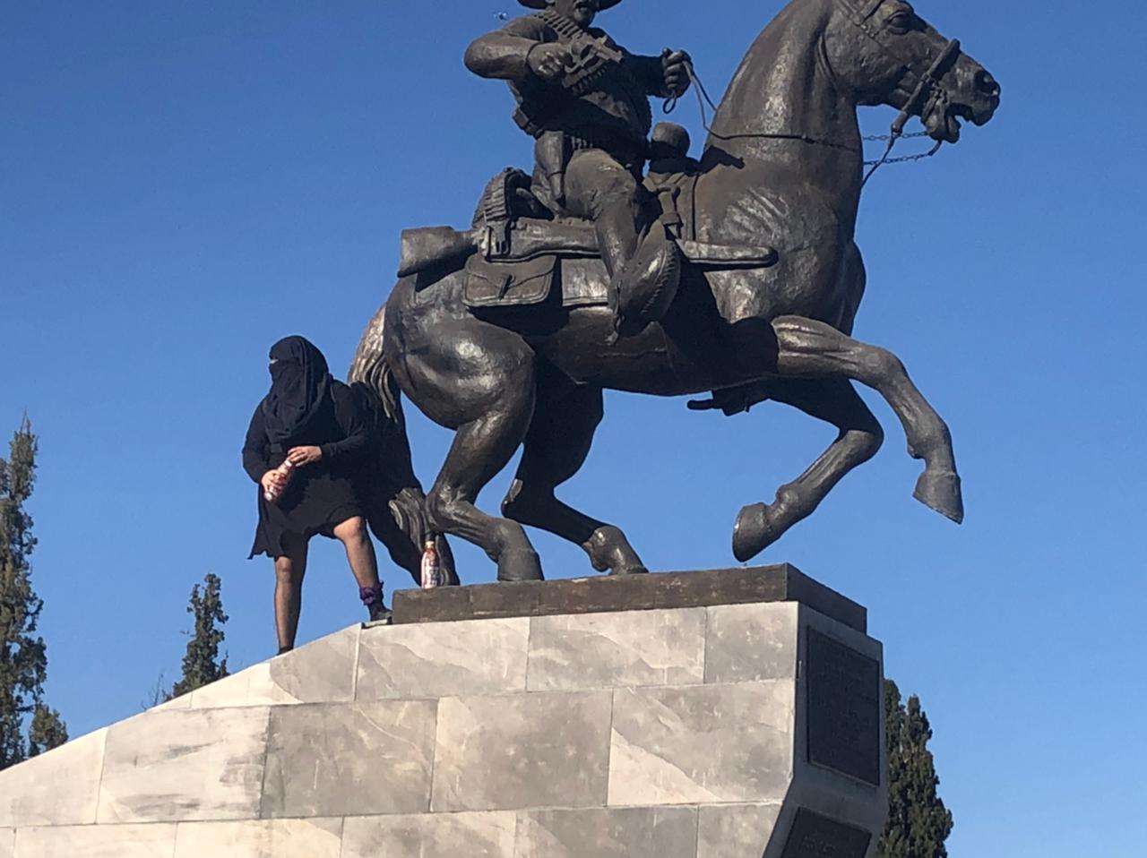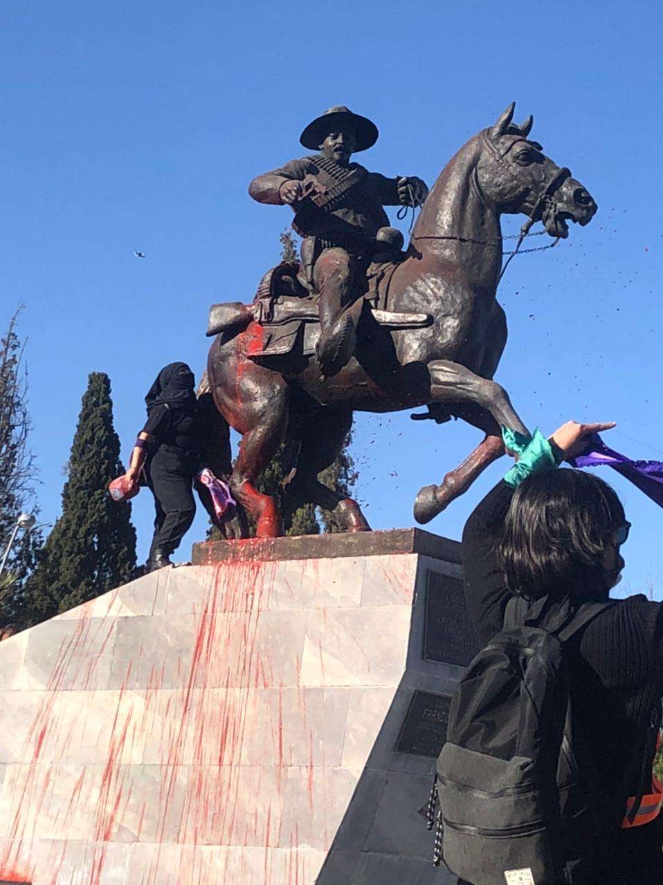 Chihuahua.- Bañan de rojo la estatua de Pancho Villa, ubicada en la intersección de las Avenida Universidad y División del Norte, esto al inicio de la marcha de diferentes contingentes y grupos de mujeres organizados en la ciudad.