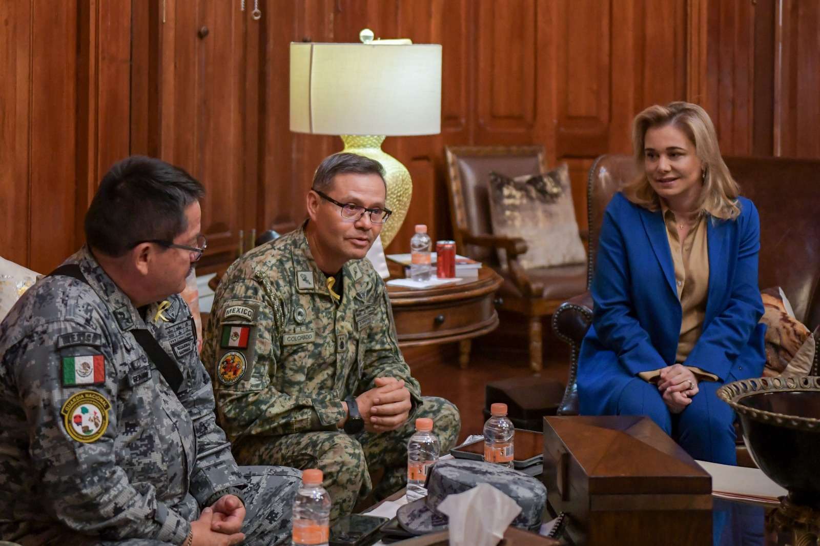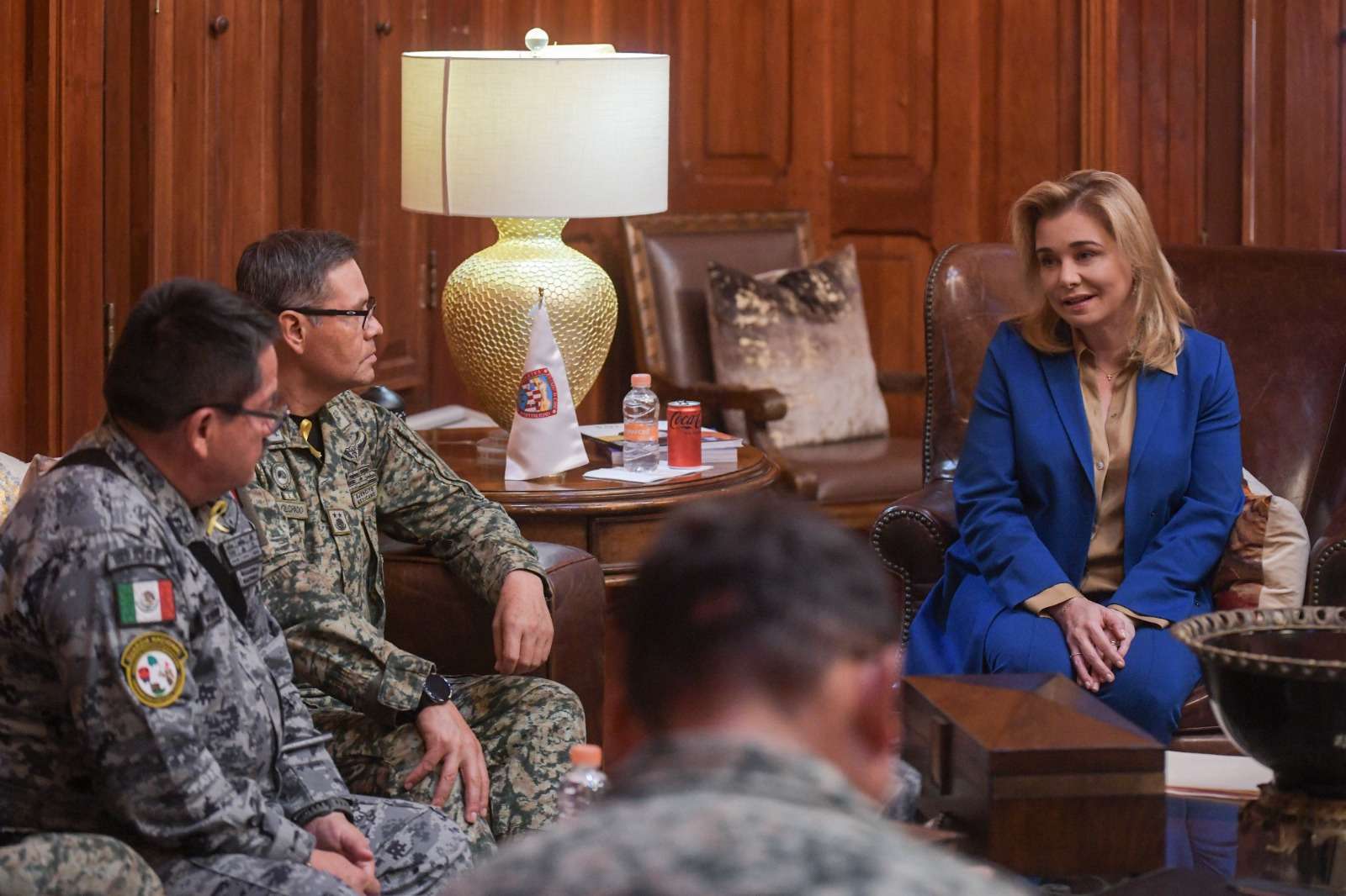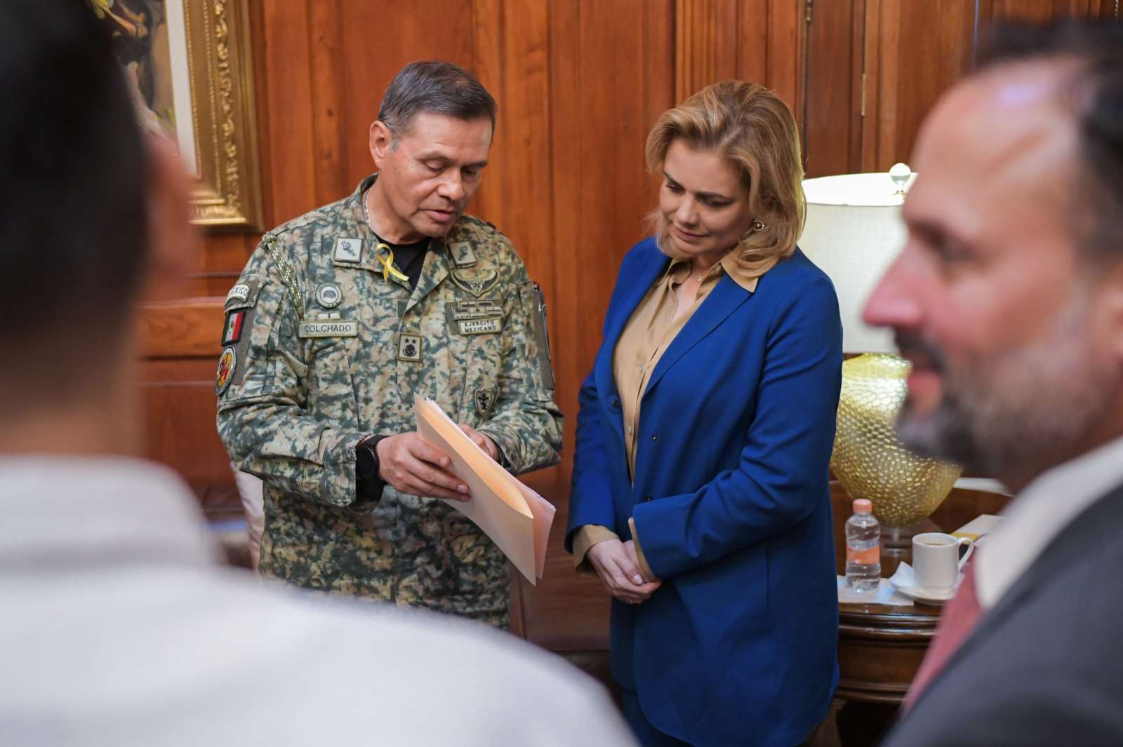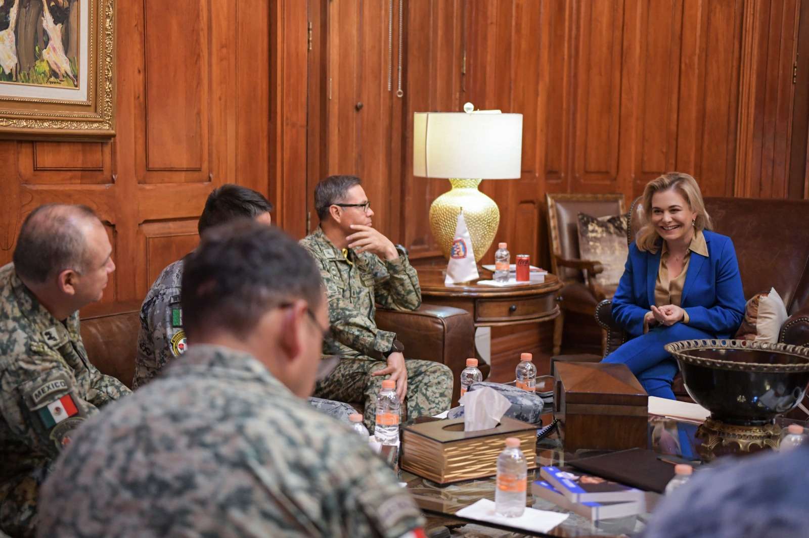 Chihuahua.- La gobernadora Maru Campos encabezó una sesión de trabajo con el comandante de la XI Región Militar, el general Fernando Colchado, con el objetivo de reforzar las estrategias para inhibir el delito y bajar los índices de delincuencia en el territorio estatal.