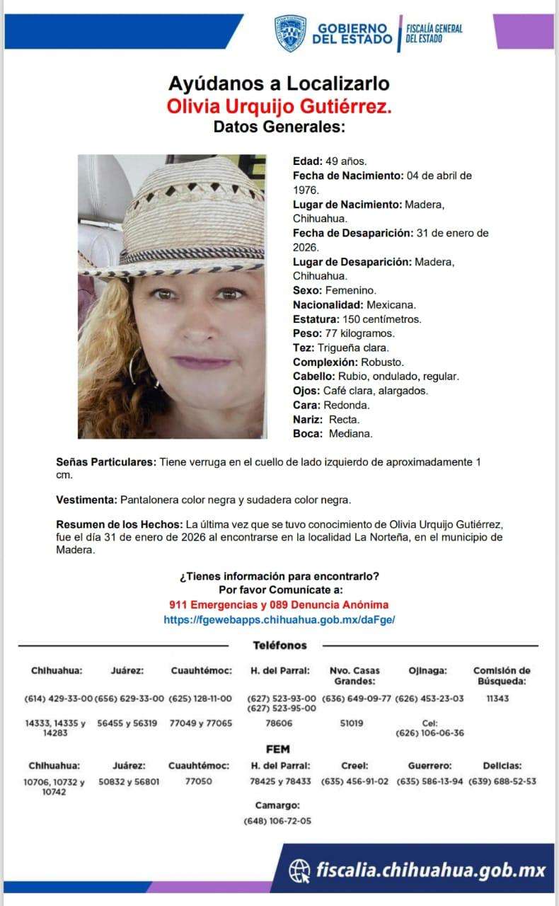 Cuauhtémoc.- La Fiscalía de Distrito Zona Occidente, a través de la Agencia Estatal de Investigación realizó un rastreo de búsqueda de cuatro personas que cuentan con reportes de desaparición interpuestos el 31 de enero del año en curso.