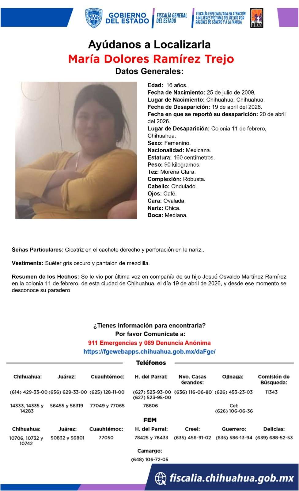 De acuerdo con la información proporcionada, María Dolores mide 1.60 metros, pesa 90 kilogramos, es de tez morena clara, complexión robusta, con cabello ondulado y ojos color café. Tiene rostro ovalado, nariz chica y boca mediana. Como señas particulares, presenta una cicatriz en el cachete derecho y perforación en la nariz. Al momento de su desaparición vestía suéter gris oscuro y pantalón de mezclilla.