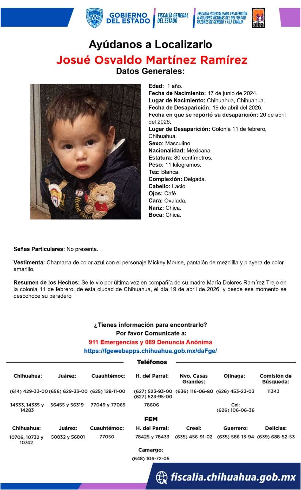 Por su parte, el menor Josué Osvaldo mide aproximadamente 80 centímetros y pesa 11 kilogramos. Es de tez blanca y complexión delgada, con cabello lacio, ojos café, cara ovalada, así como nariz y boca pequeñas. Vestía chamarra azul con el personaje Mickey Mouse, pantalón de mezclilla y playera amarilla.