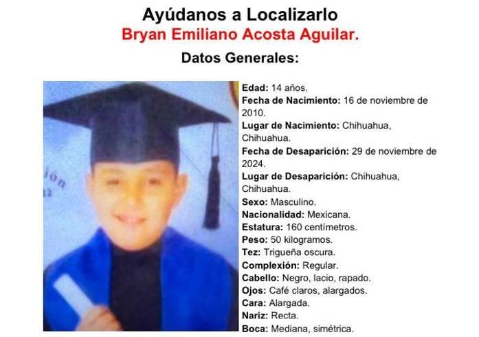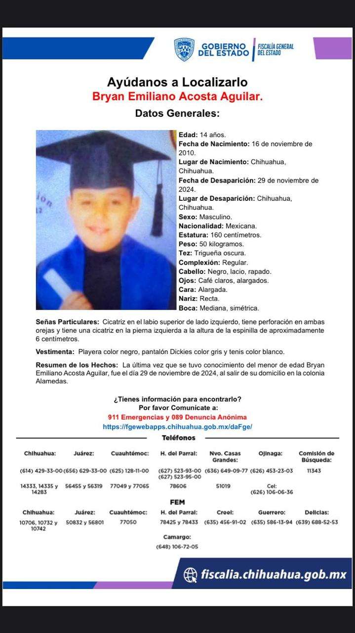 Chihuahua, Chih. - La Fiscalía General del Estado solicita la colaboración de la ciudadanía para localizar al menor Bryan Emiliano Acosta Aguilar, de 14 años, quien desapareció el 29 de noviembre de 2024 en la colonia Alameda, en Chihuahua.
