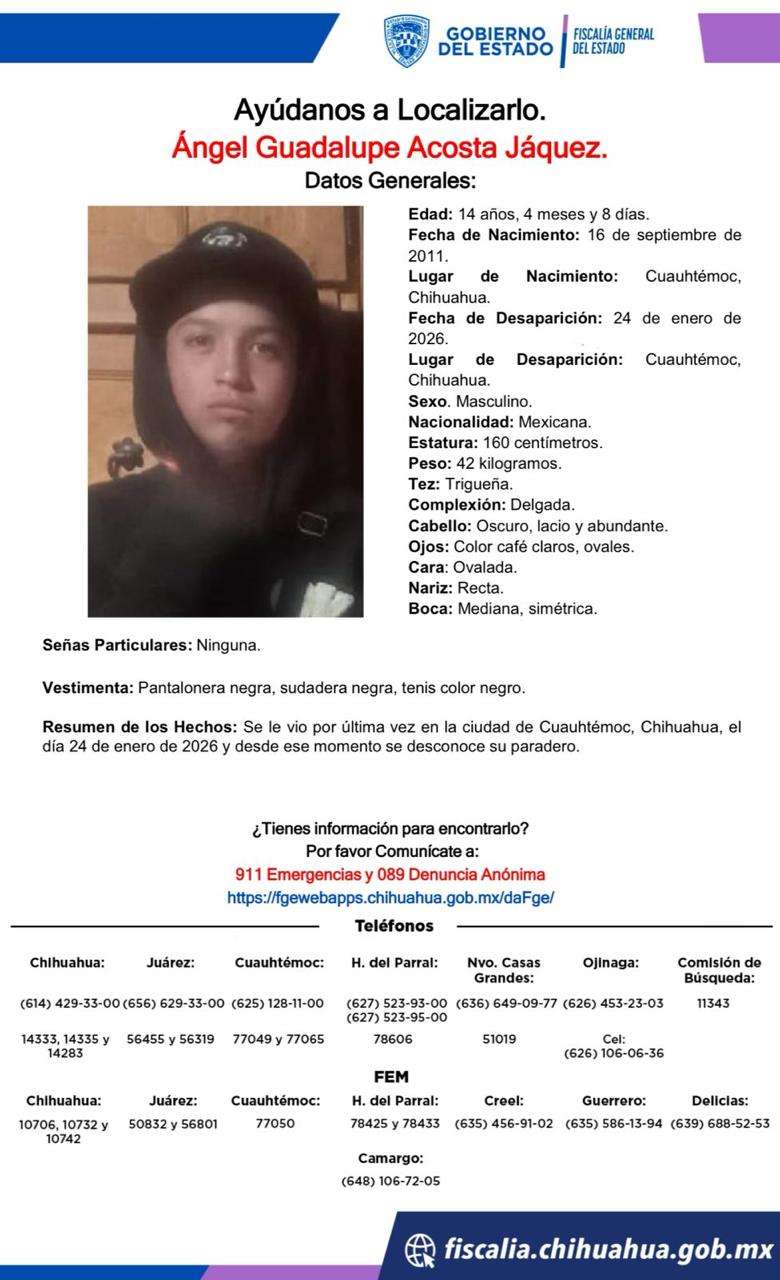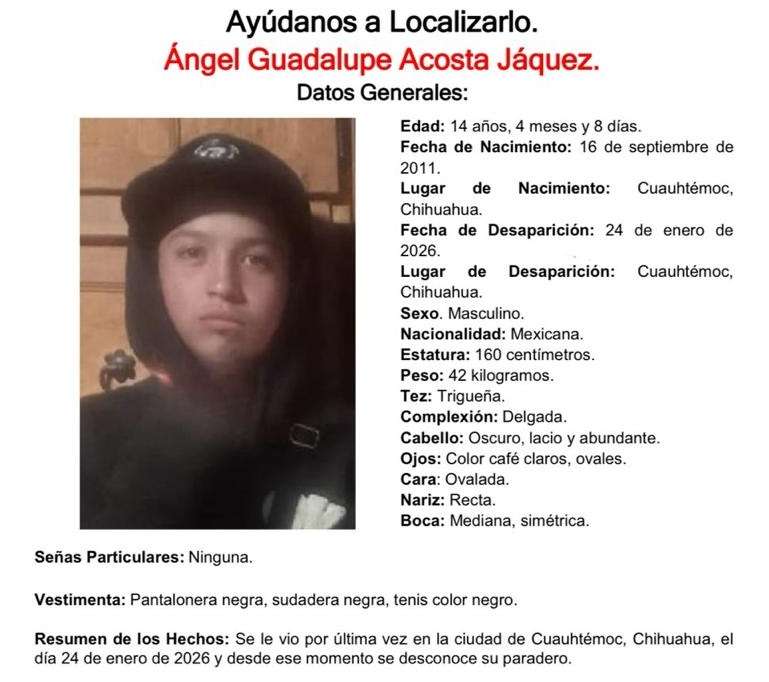 Cuauhtémoc, Chih. - Se busca al menor Ángel Guadalupe Acosta Jáquez, de 14 años, quien desapareció el 24 de enero de 2026 en Cuauhtémoc, Chihuahua. Desde entonces, no se ha tenido información sobre su paradero.