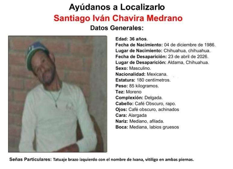 Aldama, Chih. - La Fiscalía General del Estado (FGE) emitió una pesquisa urgente para localizar a Santiago Iván Chavira Medrano, de 36 años de edad, quien fue visto por última vez el pasado 23 de abril de 2026 en la ciudad de Aldama, Chihuahua.