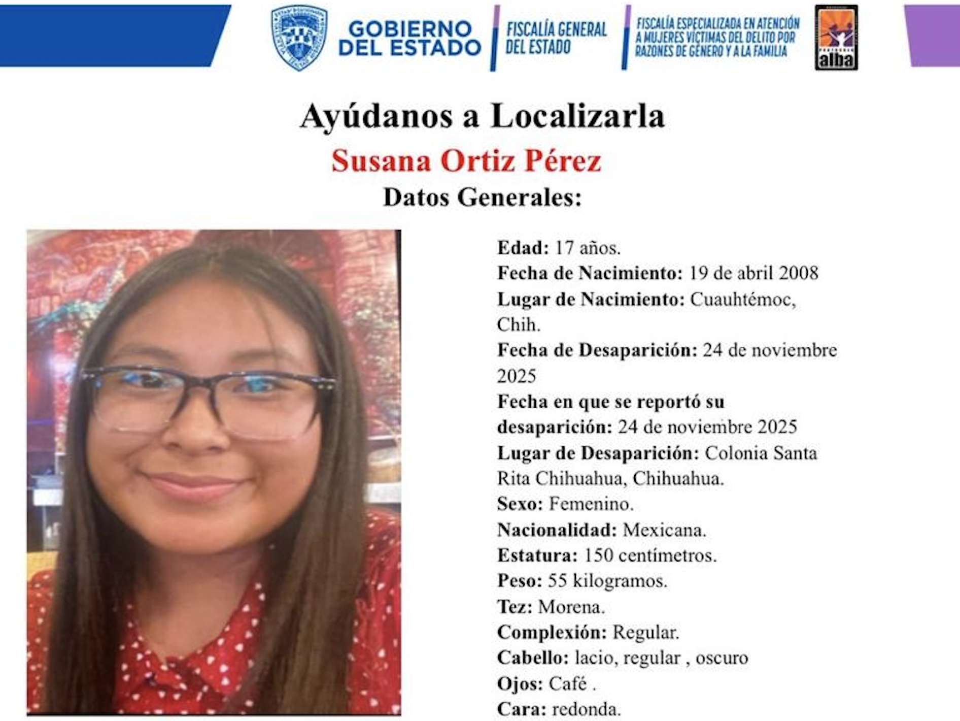 Chihuahua.- La adolescente Susana Ortiz Pérez, de 17 años, desapareció desde este 24 de noviembre en la ciudad de Chihuahua.