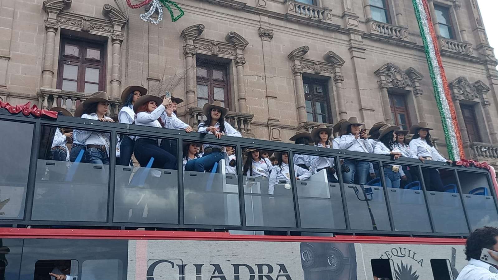 Una traila fue habilitada para que la Banda de Música amenizará la cabalgata con música totalmente en vivo, en un camión turpistico viajaban las 40 candidatas a Reyna de la Expogan Chihuahua 2025.