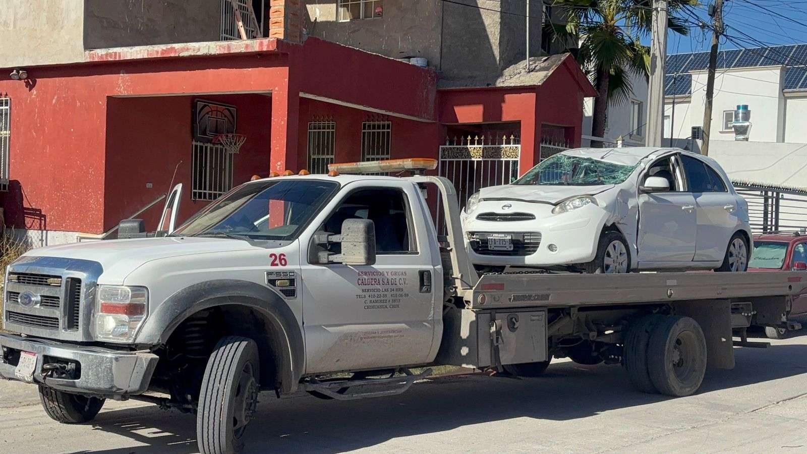 Chihuahua, Chih.– Un vehículo Nissan March cayó a un canal tras verse involucrado en un choque con una camioneta Jeep Liberty, en el cruce de la calle 46 y Manuel Estrada, en la colonia Unidad Proletaria.