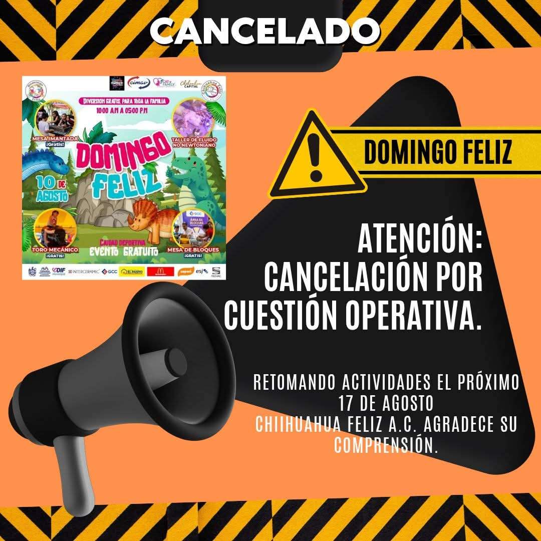 Chihuahua.- El tradicional “Domingo Feliz” que se realiza en la Deportiva fue cancelado este fin de semana, informó la organización Chihuahua Feliz a través de sus redes sociales. La suspensión se atribuye a motivos de gestión operativa.