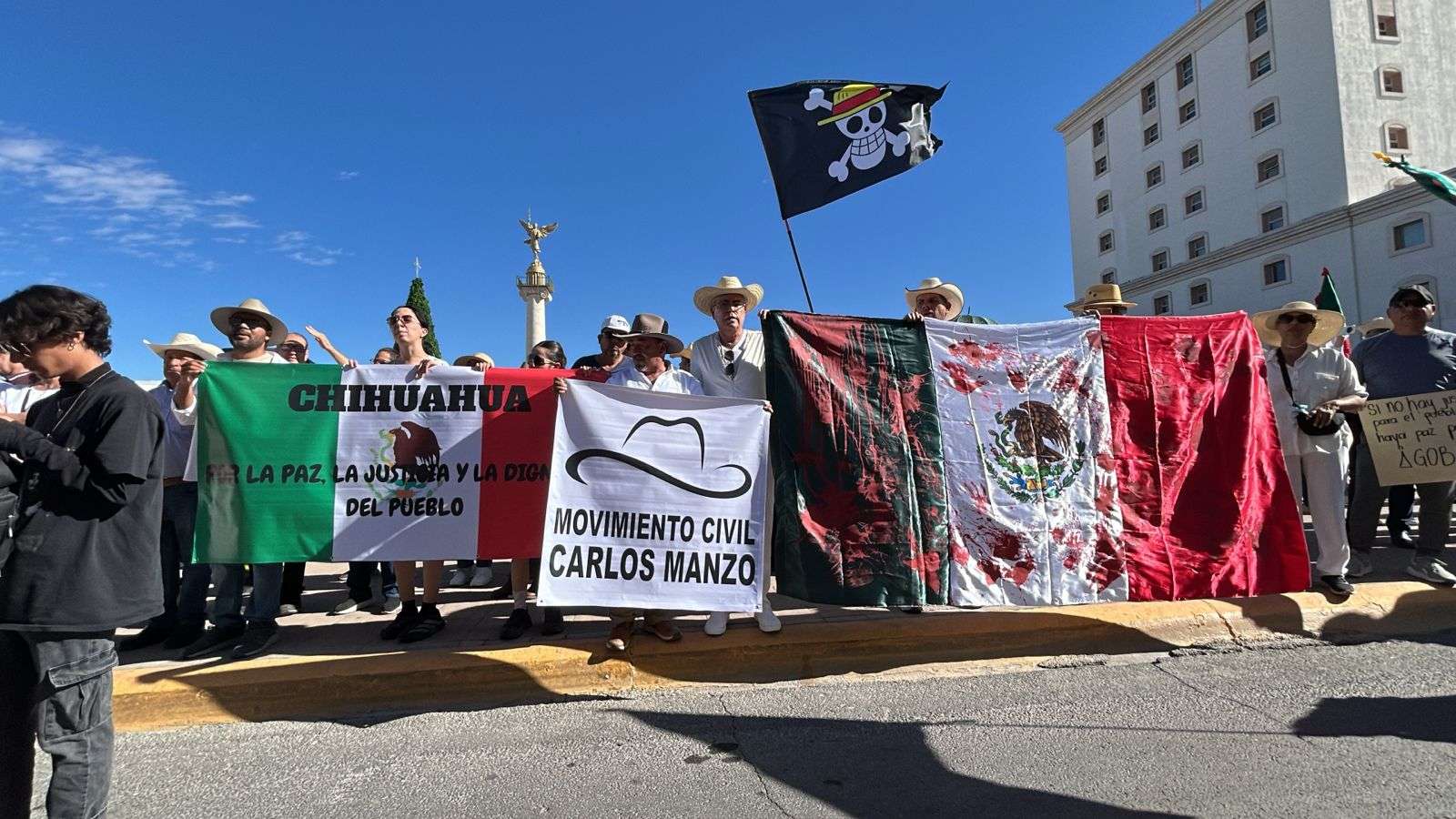 Los manifestantes portaban banderas de México con leyendas como “Chihuahua por la paz, la justicia y la dignidad del pueblo”, así como banderas negras con una calavera y una bandera nacional cubierta de pintura roja simulando sangre.
