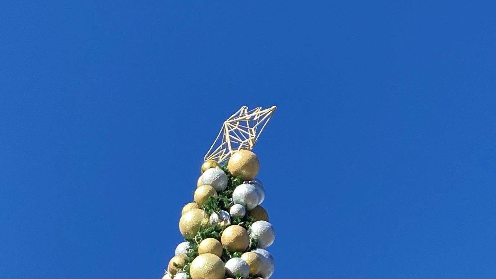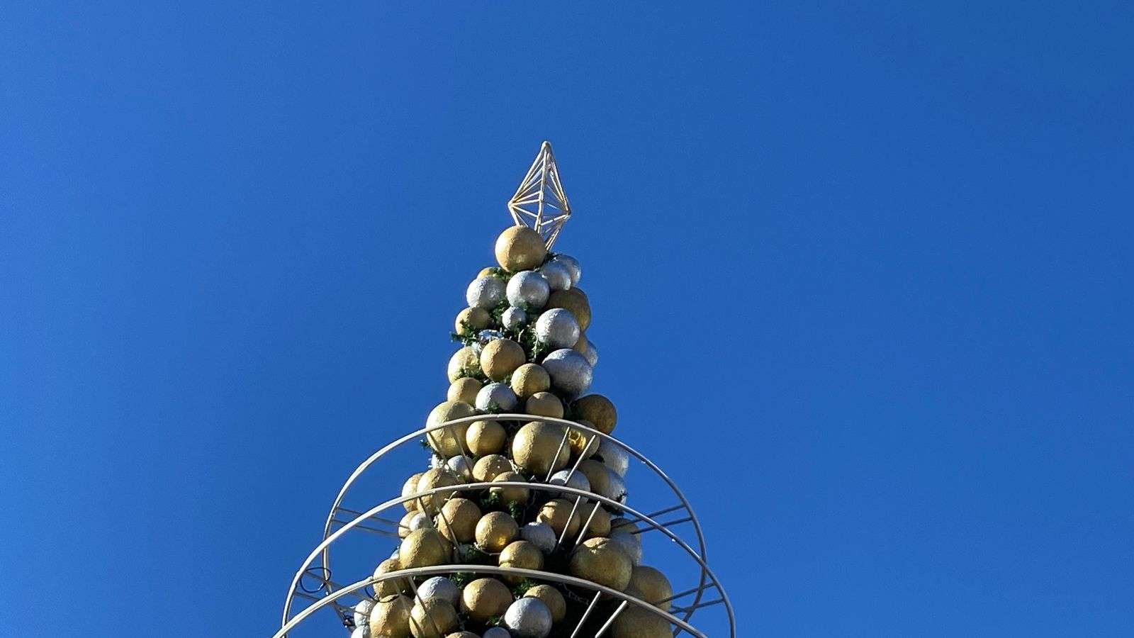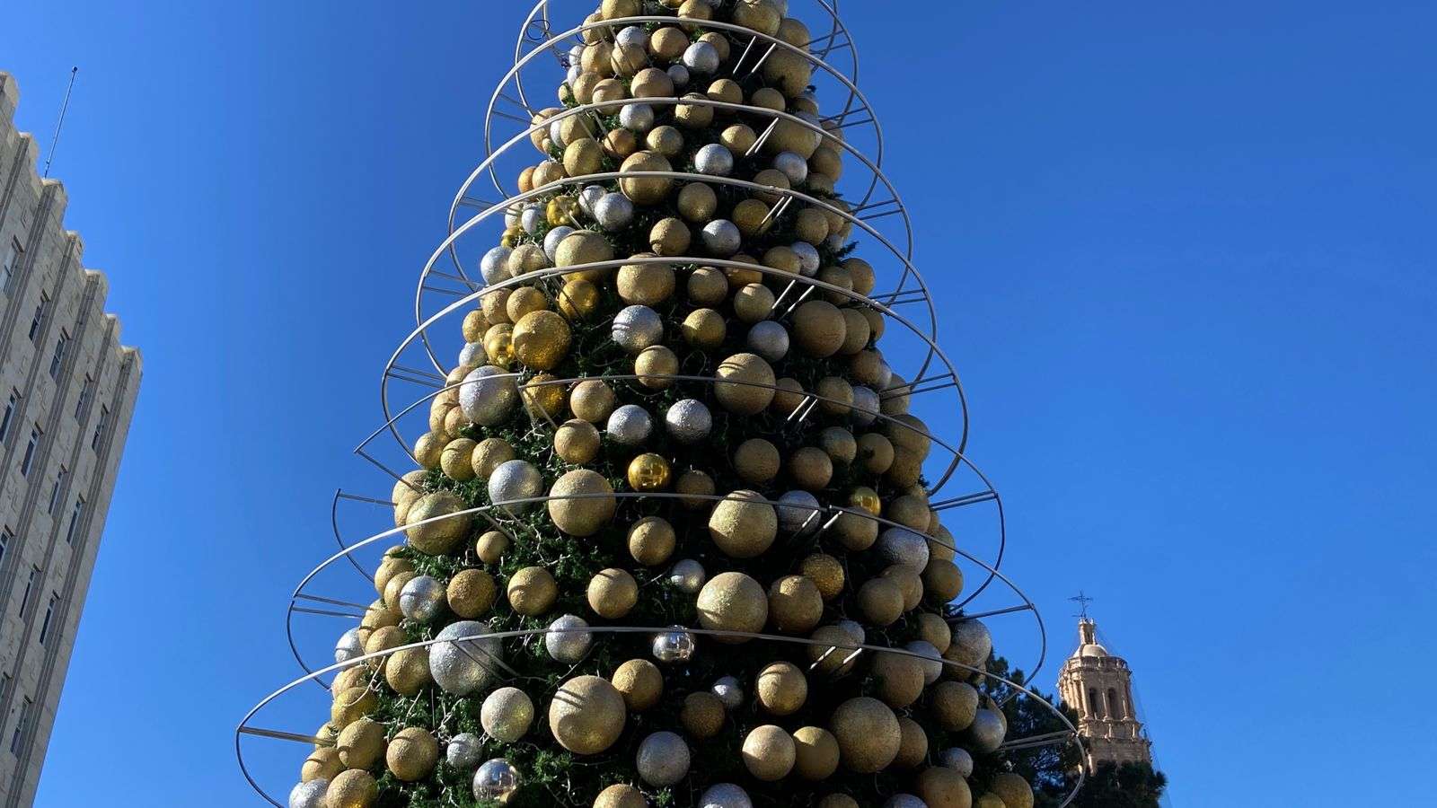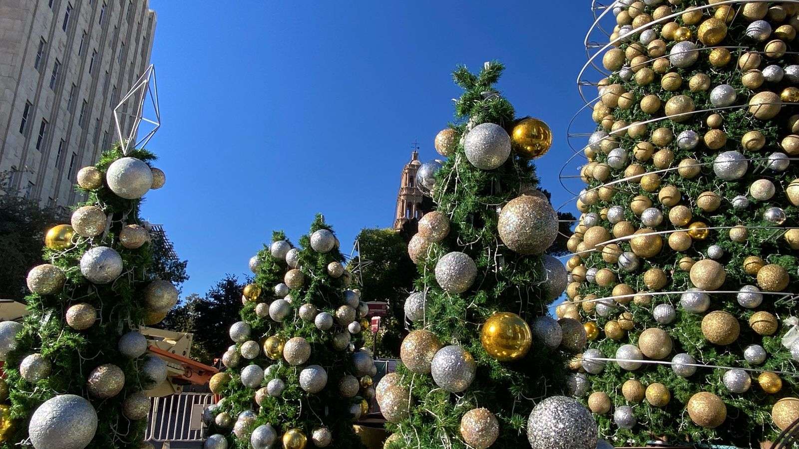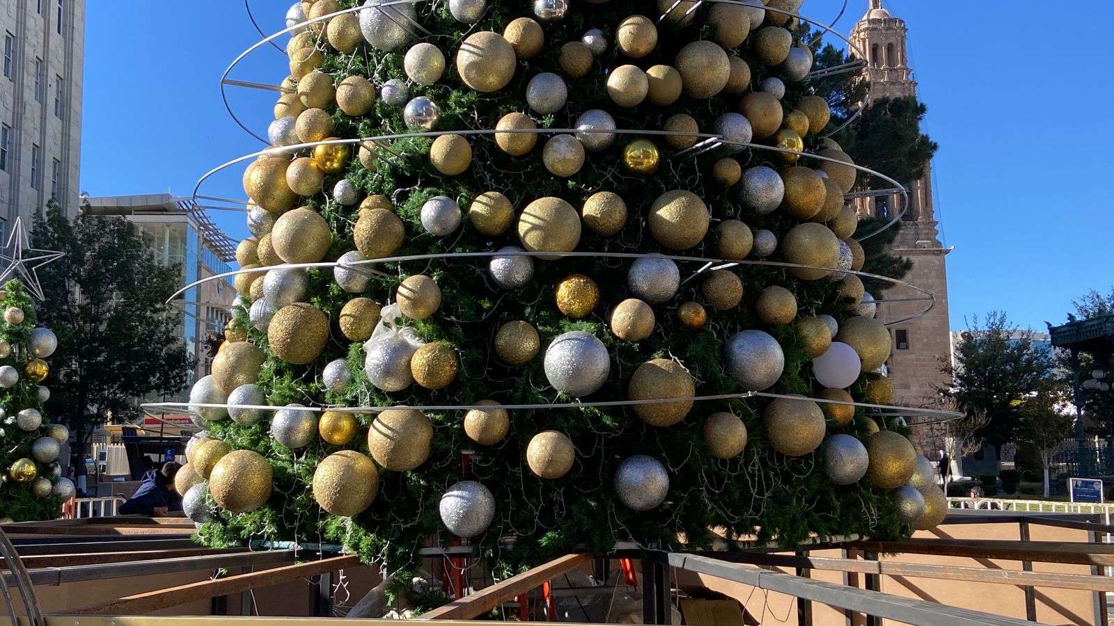 Al árbol también se le están instalando grandes esferas plateadas y doradas, esferas medianas en color dorado y una tira plateada que rodea toda la estructura.