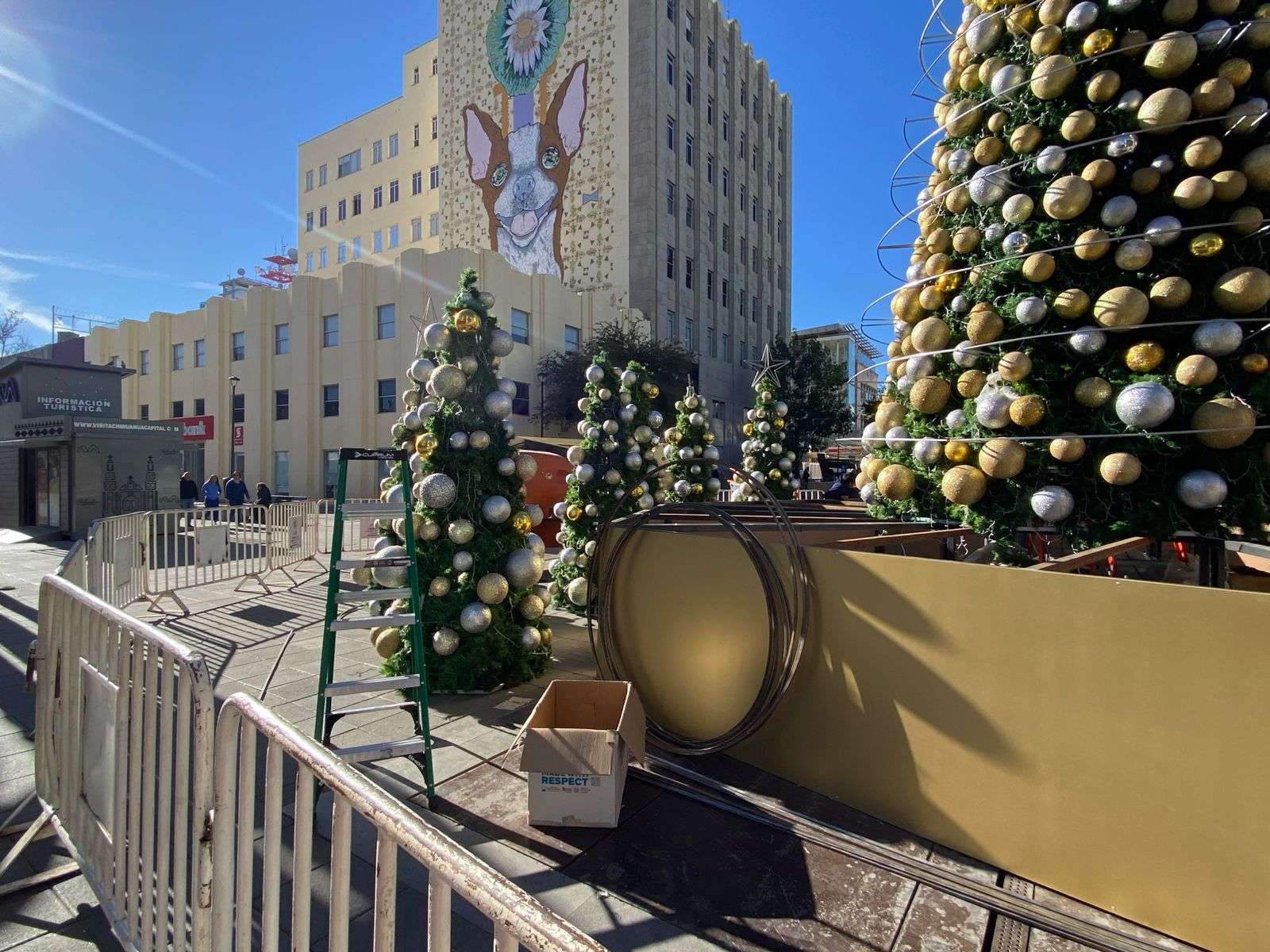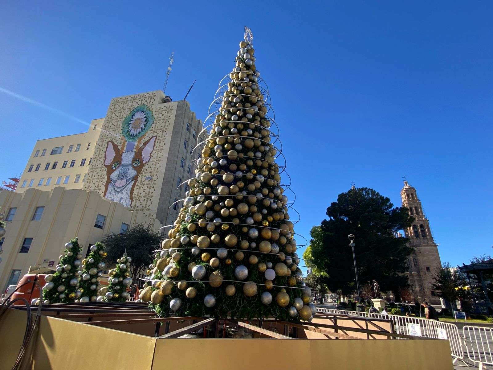 Chihuahua.- En la Plaza de Armas, trabajadores continúan con la instalación del Árbol de Navidad, que ahora cuenta con cinco árboles colocados alrededor del árbol principal.