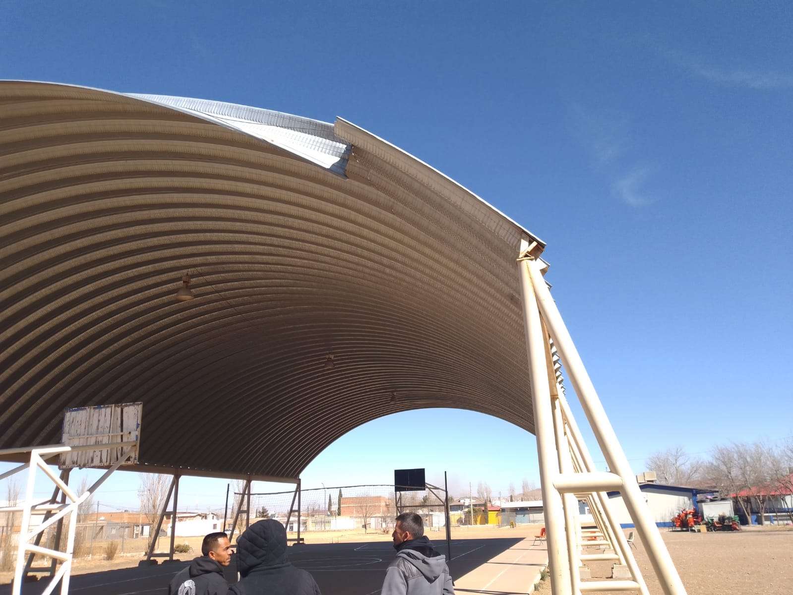 12:00 horas, en la primaria Valentín Gómez Farías, calles 120 y Villa Santa María, hay un domo en movimiento. Es una estructura de gran tamaño, se me brindan recomendaciones para evitar accidentes.