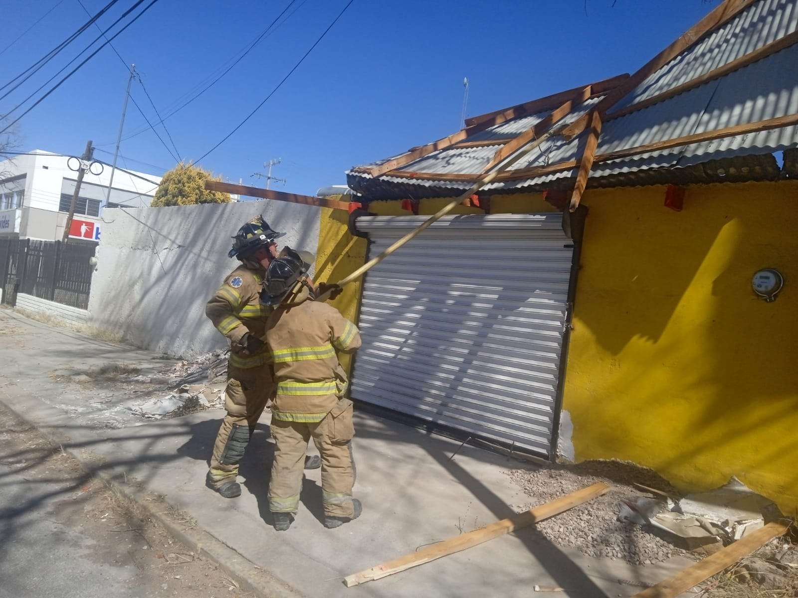 Luego, en las calles Argentina y Belisario Chávez, un local amarillo sufrió desprendimiento de techo, siendo éste de lámina con estructura madera.