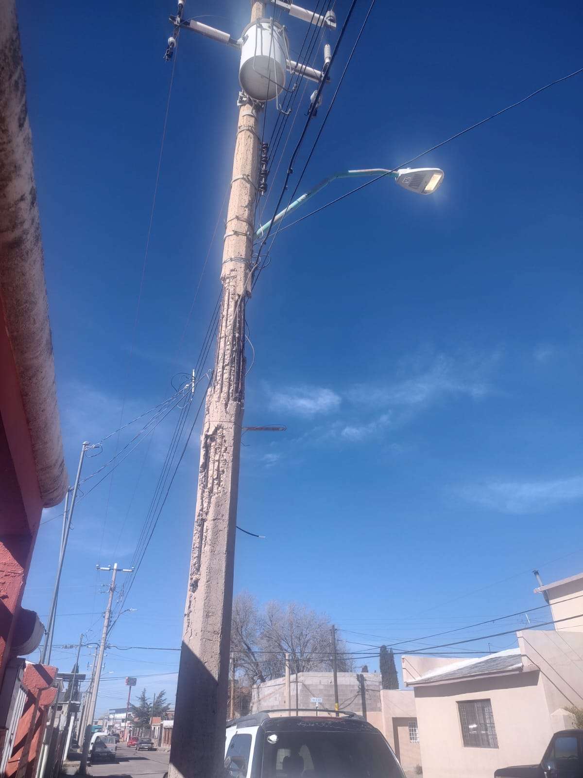 Al hacer recorridos en el lugar, se detectaron dos postes con fracturas en el cuerpo, por tal motivo se solicitó el apoyo de la CFE para subsanar lo más rápido posible, ya que representa un riesgo a la población.