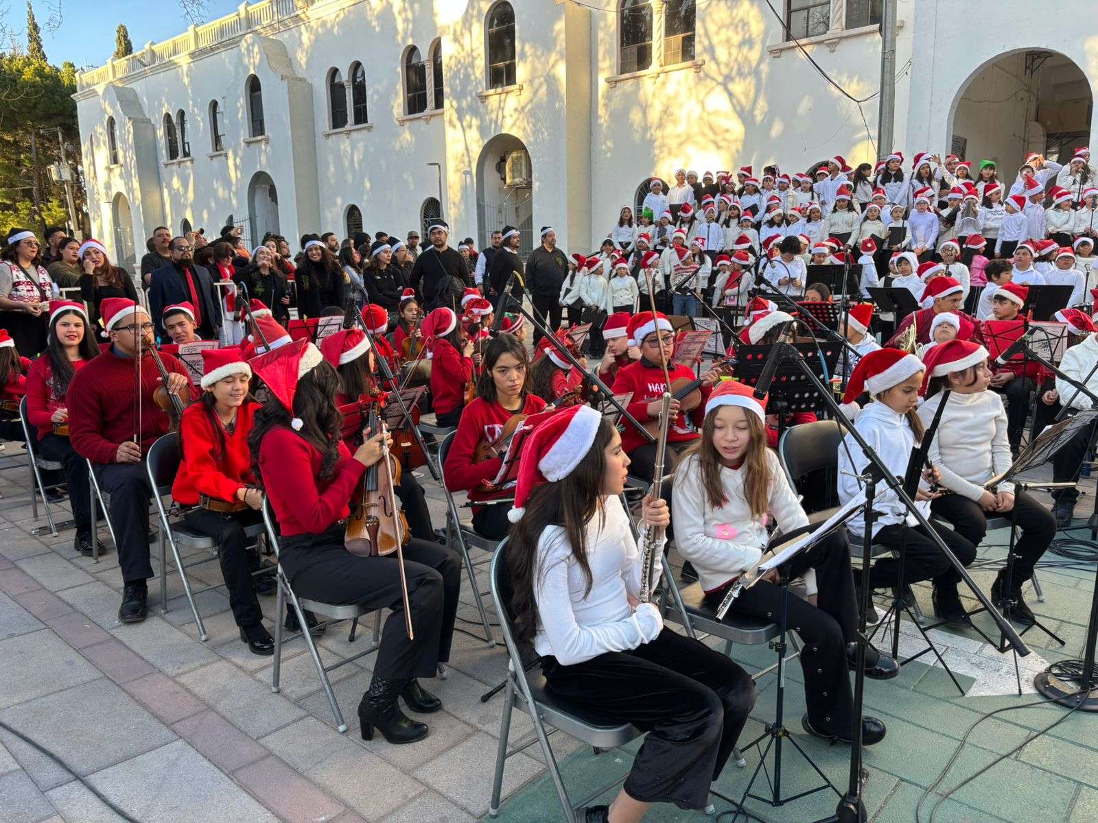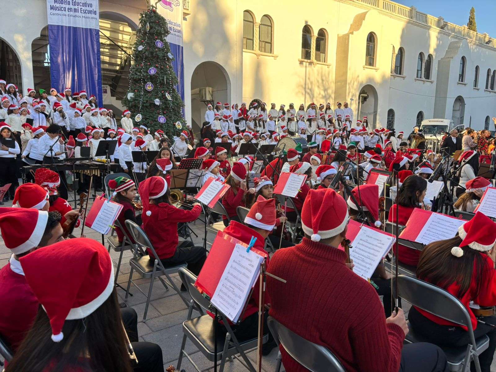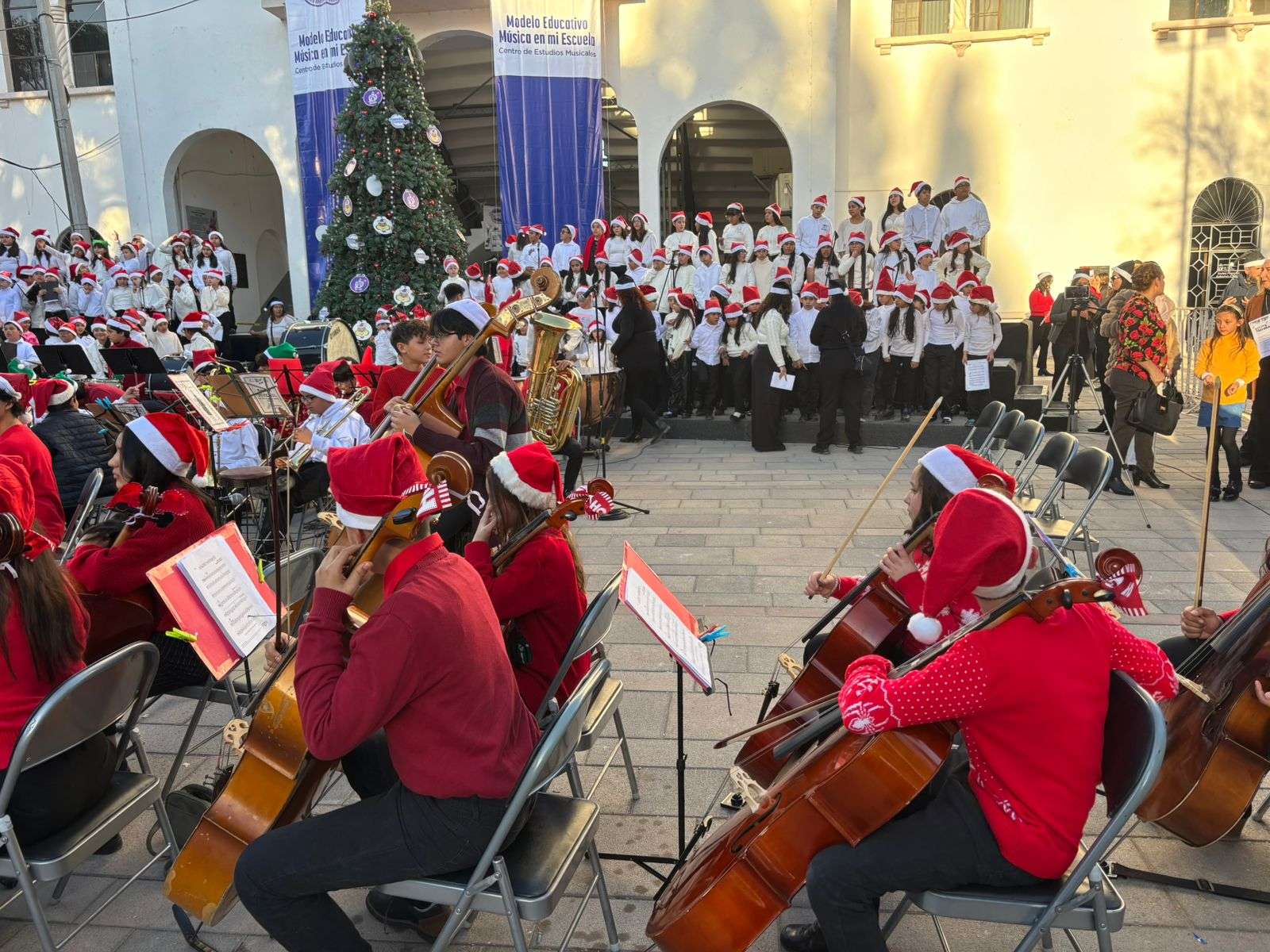Chihuahua.- Participantes del programa música "En Mi Escuela", tocaron esta tarde en el Discóbolo de la Ciudad Deportiva participando en un Festival Navideño, en donde demostraron su talento musical aprendido en dicho programa.