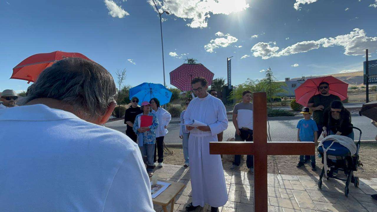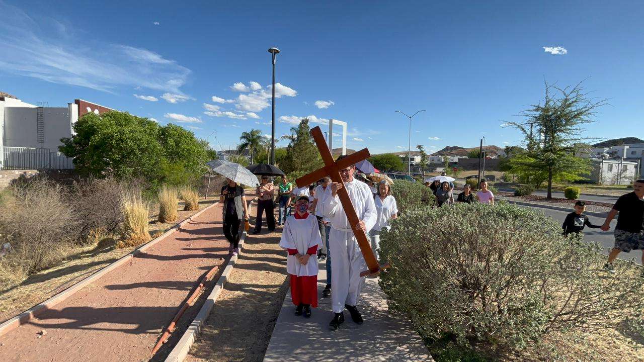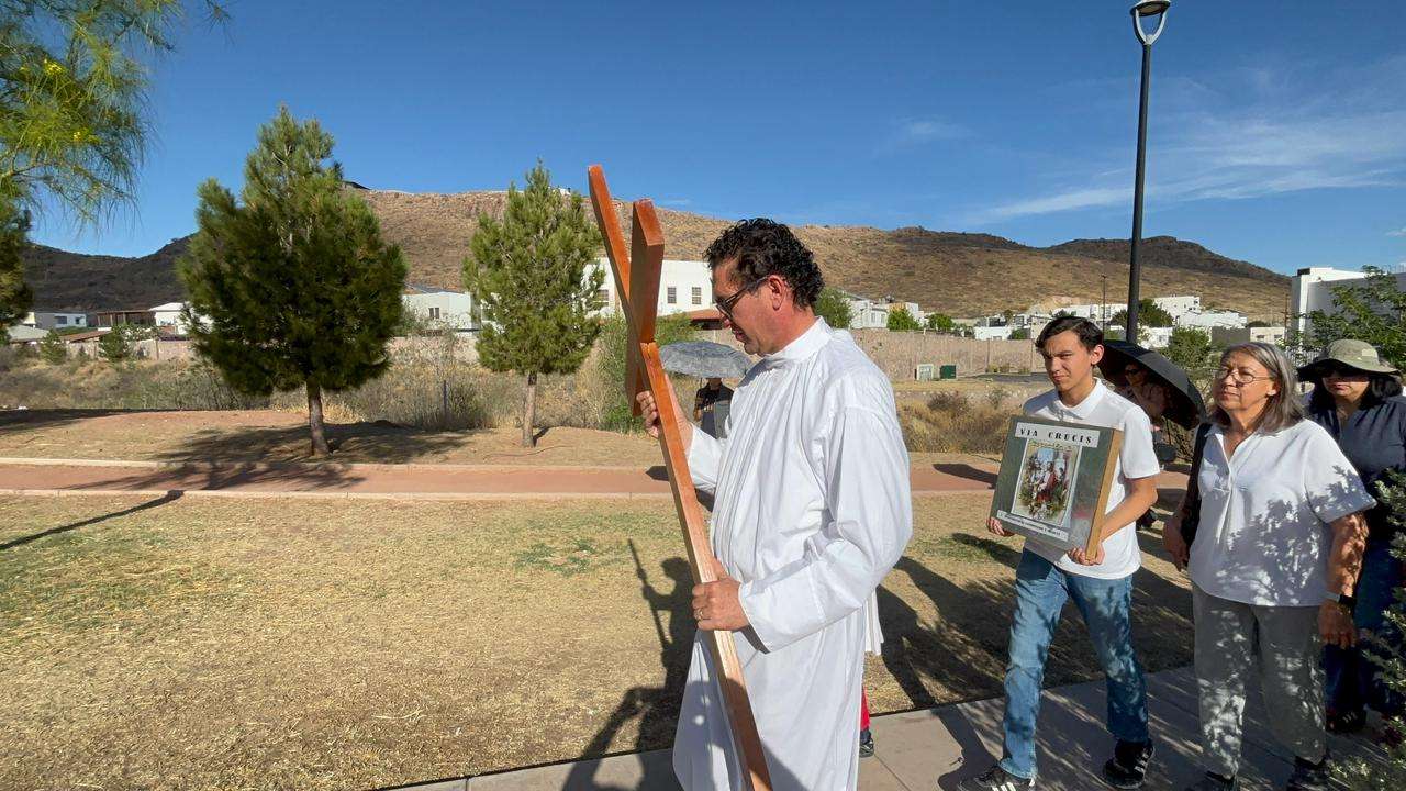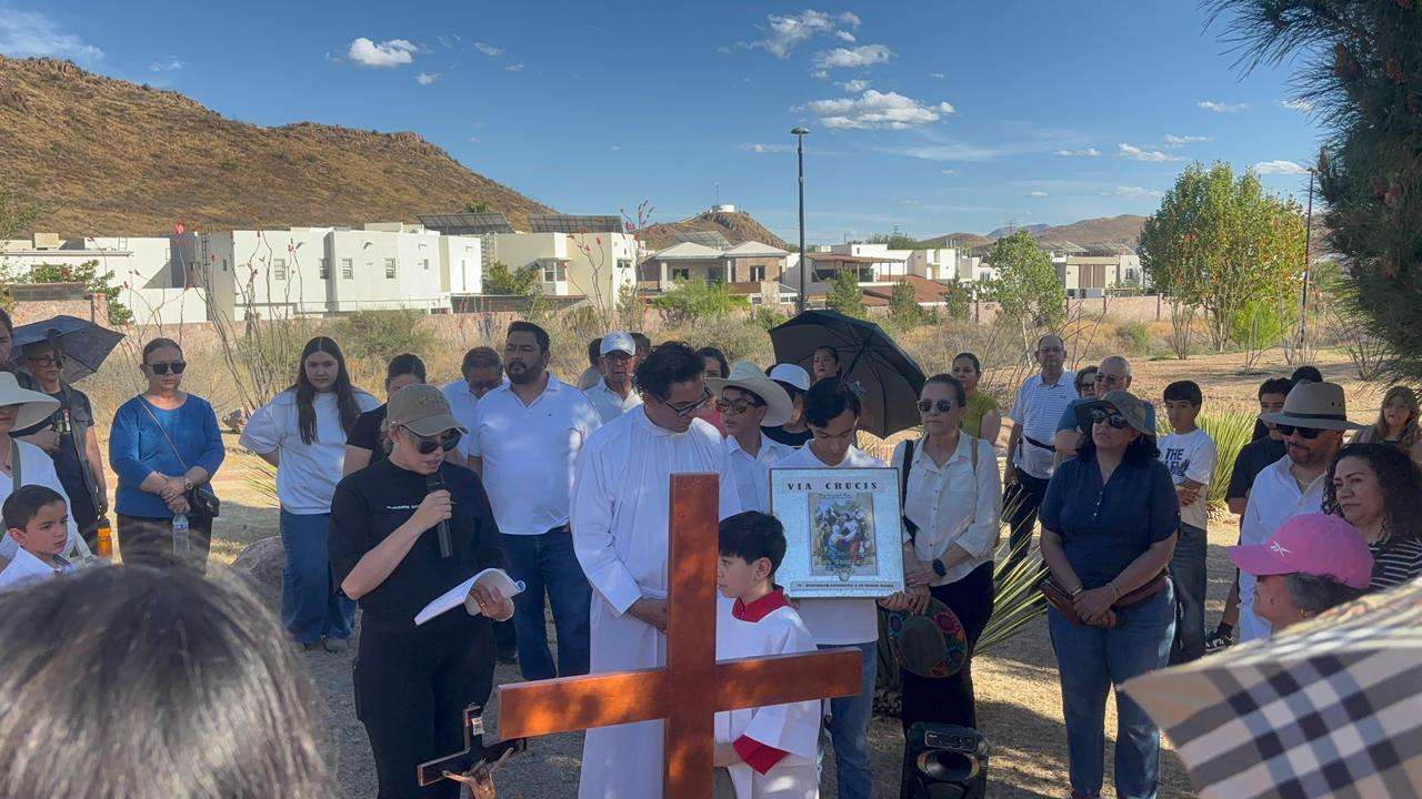 Chihuahua.- Bajo la guía del Diácono Giovanni Guzmán, vecinos de diversos fraccionamientos aledaños a la Misión Padre Pío realizaron este Viernes Santo un acompañamiento espiritual en la Pasión y Muerte de Jesús.