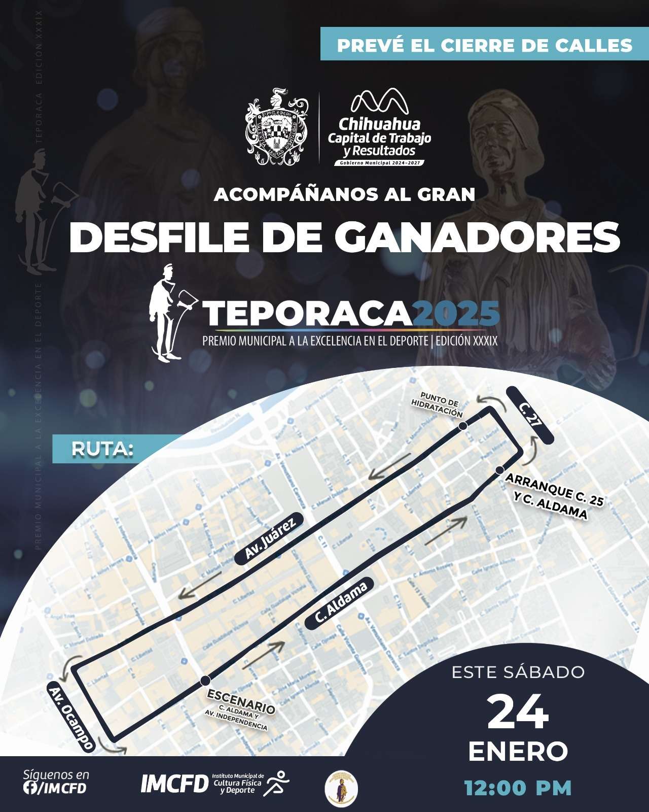 Chihuahua, Chih.- El Gobierno Municipal anuncia el cierre de calles del Centro de la ciudad por el tradicional desfile de los deportistas ganadores del Premio Municipal a la Excelencia en el Deporte, “Teporaca”, este sábado 24 de enero a las 12:00 horas.