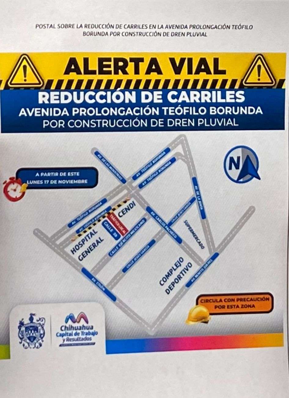 Chihuahua.- El director de Obras Públicas Municipales, Carlos Rivas Martínez, anunció que a partir del lunes 17 de noviembre, a las 9:00 de la mañana, se cerrará la circulación en un tramo de la avenida Teófilo Borunda, desde la calle 8 de Octubre hasta la avenida Pacheco.