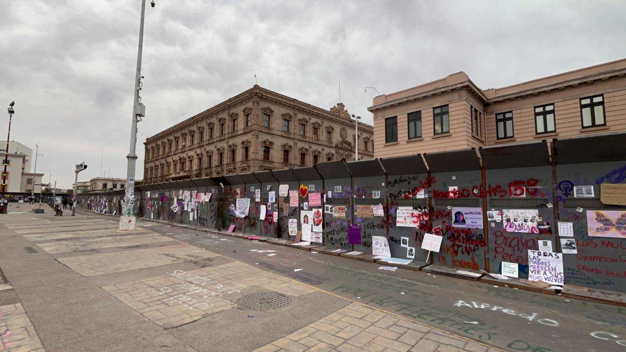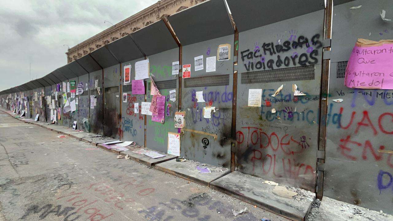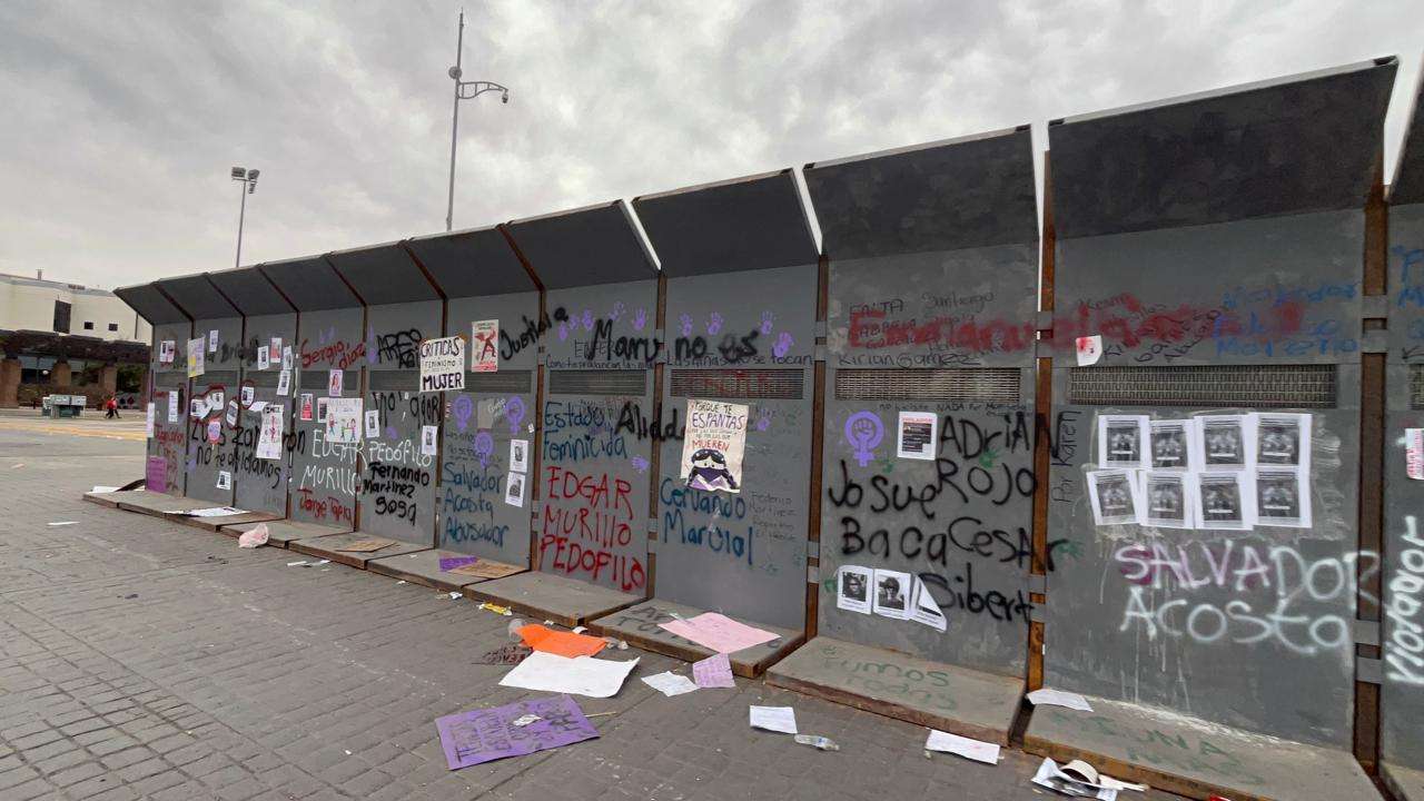 Las vallas no solo cumplen su función de barrera física, sino que ahora sirven como un recordatorio visual de la reciente movilización por el Día Internacional de la Mujer.