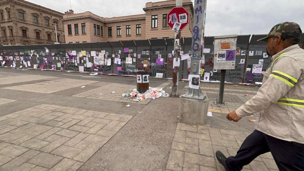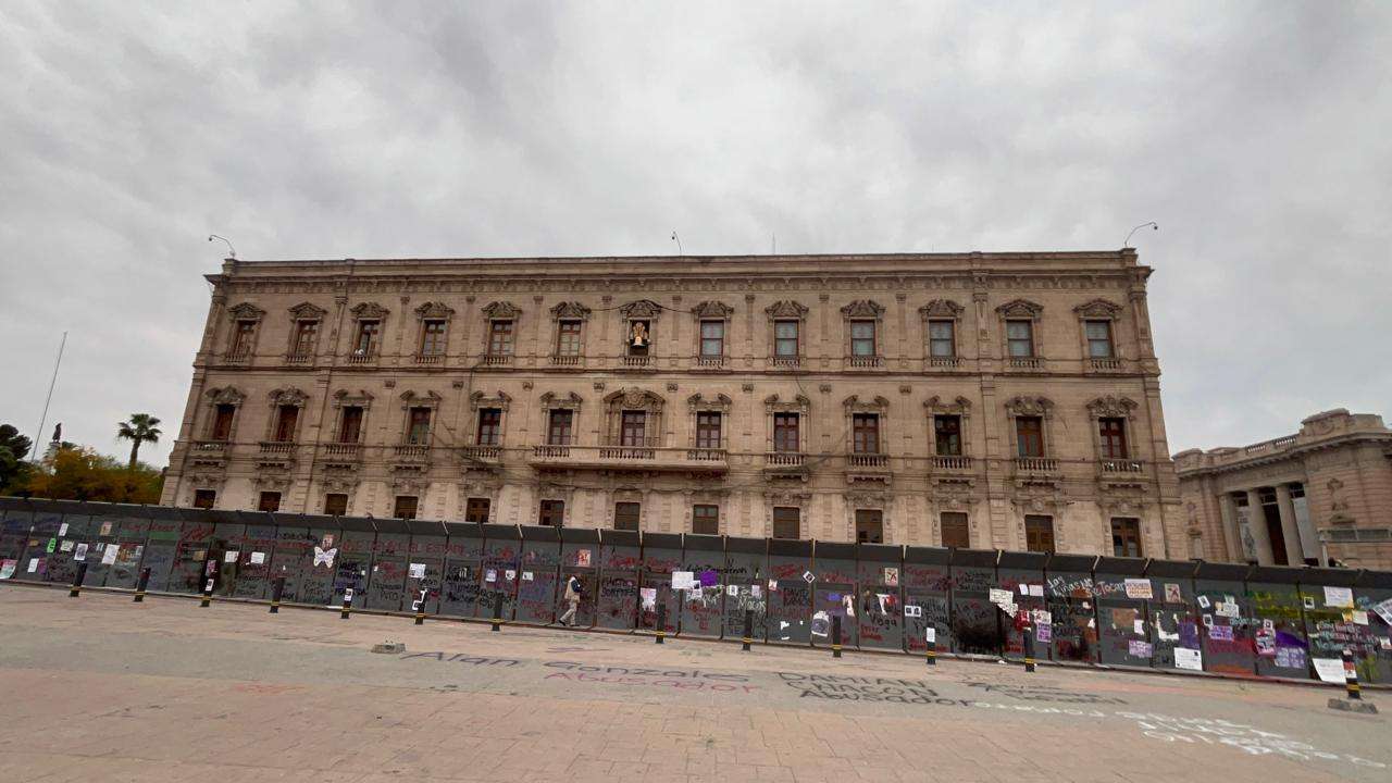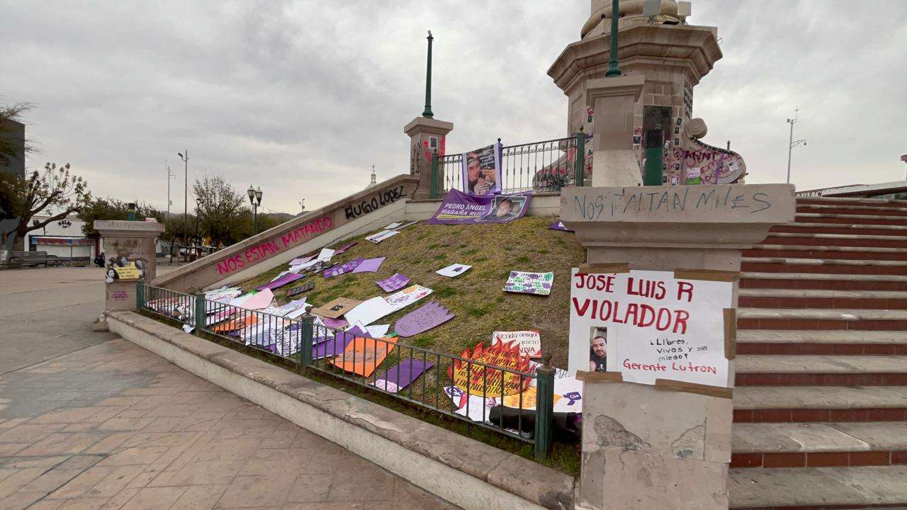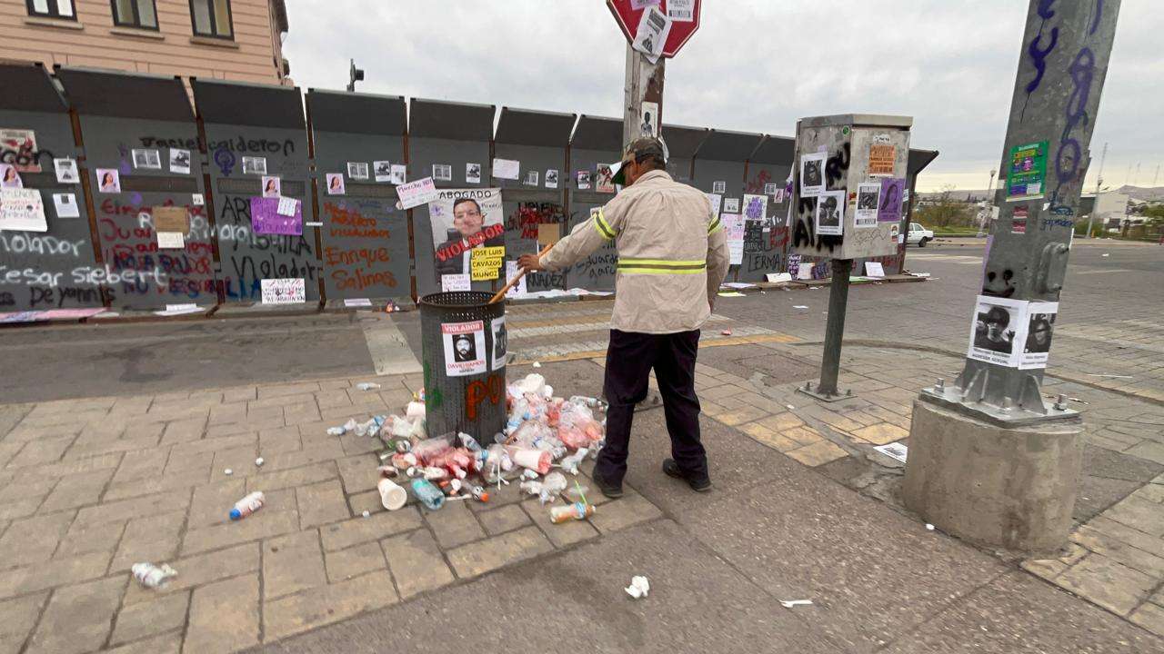 Las vallas no solo cumplen su función de barrera física, sino que ahora sirven como un recordatorio visual de la reciente movilización por el Día Internacional de la Mujer.
