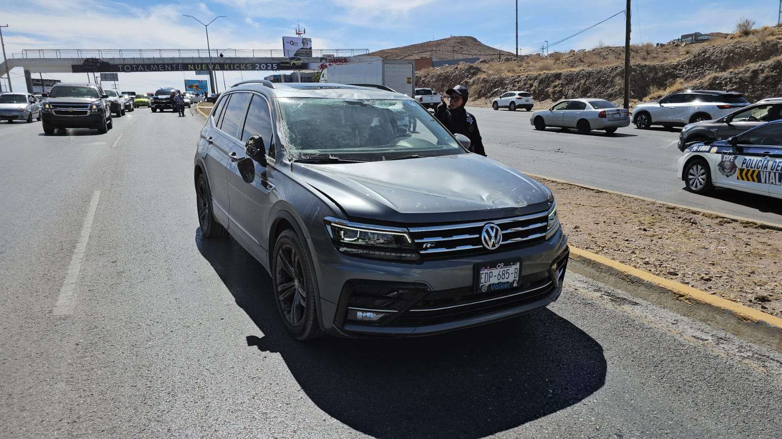 La camioneta se proyecta contra el camellón y se impacta contra una luminaria la cual derribó y cayó en el sentido opuesto encima de una camioneta Volkswagen Tiguan.