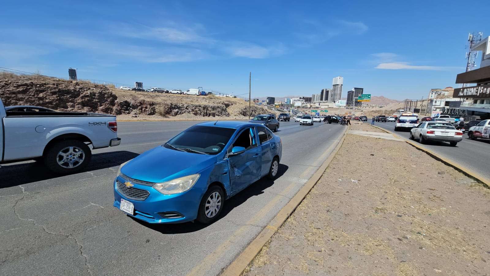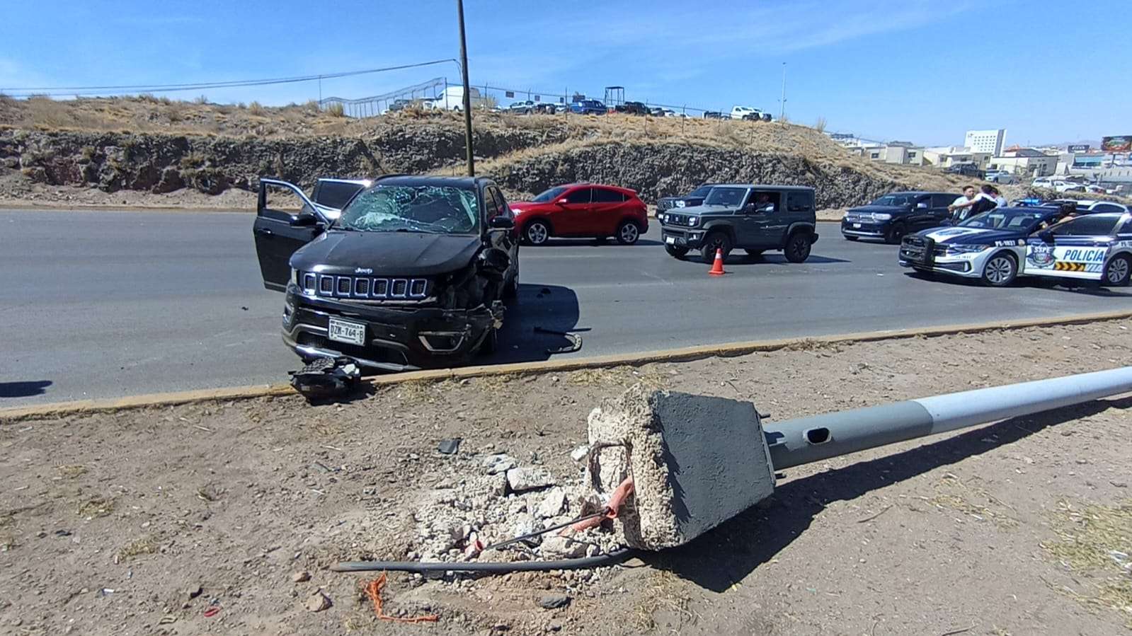 Chihuahua.- Una mujer chocó su auto contra una camioneta en pleno periférico de la Juventud y provocó un segundo choque y caída de un poste de luz.