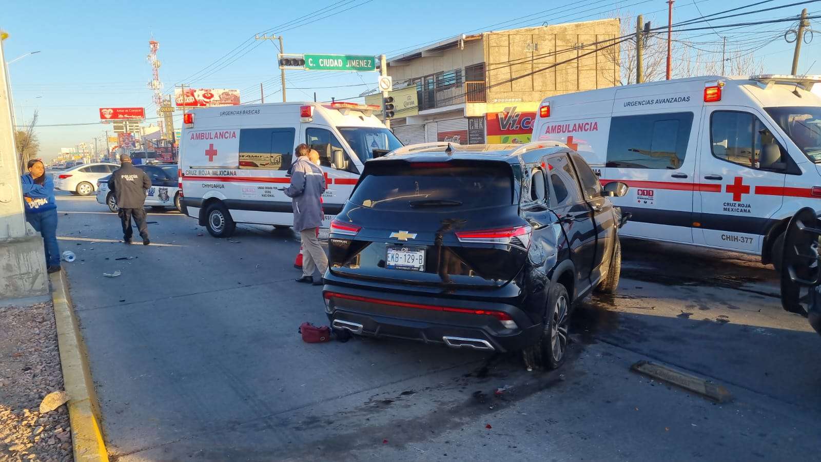 Chihuahua.- En el cruce de la Avenida Tecnológico y la calle Ciudad Jiménez, en la Colonia Revolución, se registró un aparatoso accidente debido a los semáforos apagados, que dejó a una mujer y a su hijo de 13 años con lesiones de consideración.
