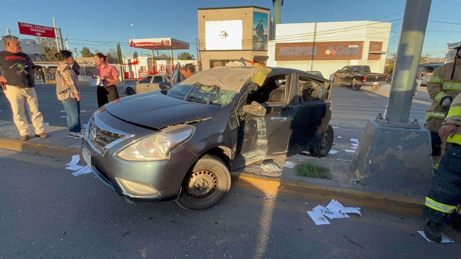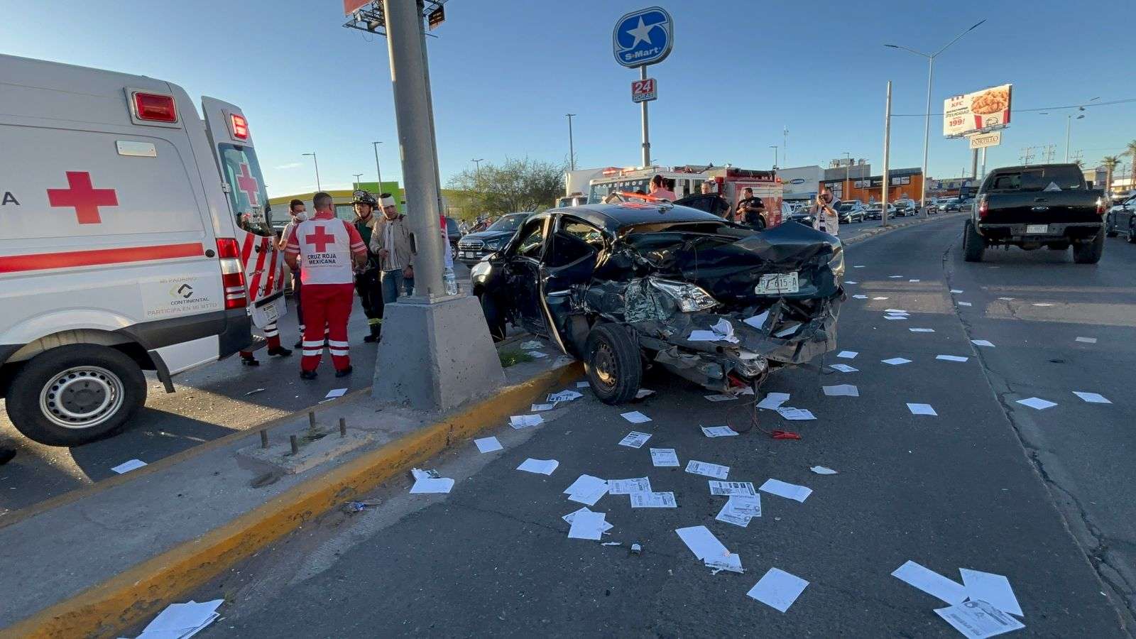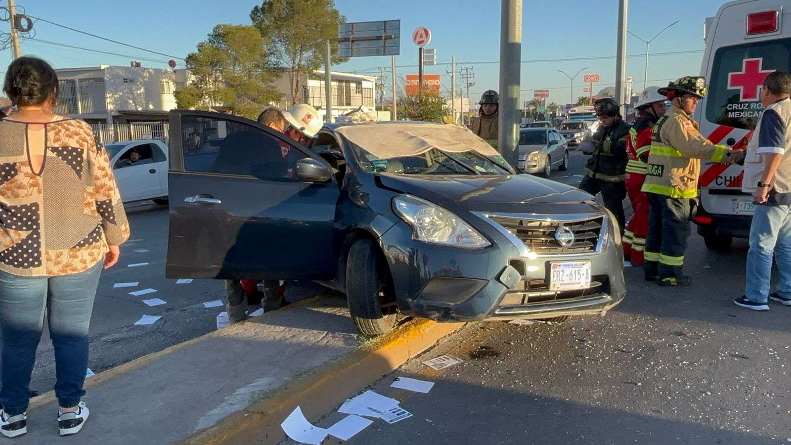 Chihuahua.- Un choque que dejó una persona lesionada, se registró en la avenida Tecnológico y casi Juan Escutia, entre un auto Nissan Versa y un camión de pasajeros de la ruta Riberas con número económico 380.