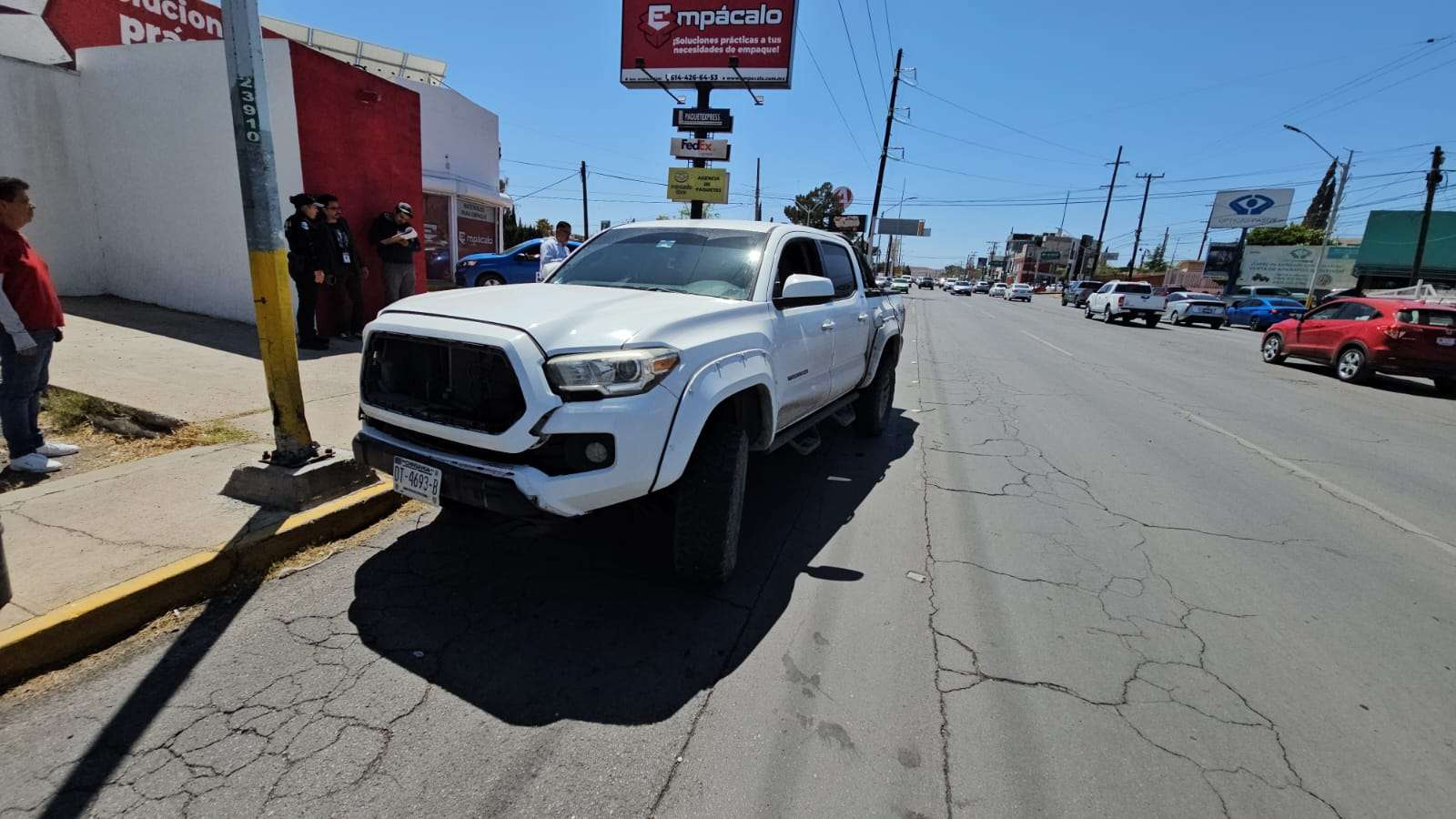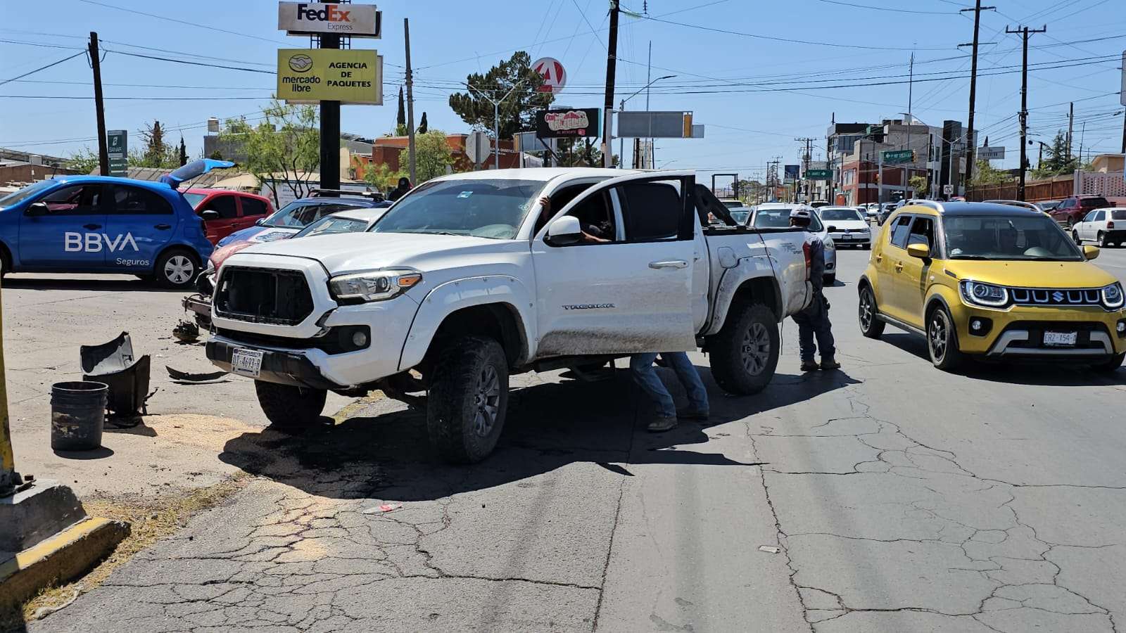 Chihuahua.- Un accidente vehicular ocurrió en la avenida de Las Américas, cuando el conductor de una pickup Toyota Tacoma, que circulaba en dirección de este a oeste, intentaba ingresar a un negocio de paquetería cercano al cruce con la avenida Francisco Villa.