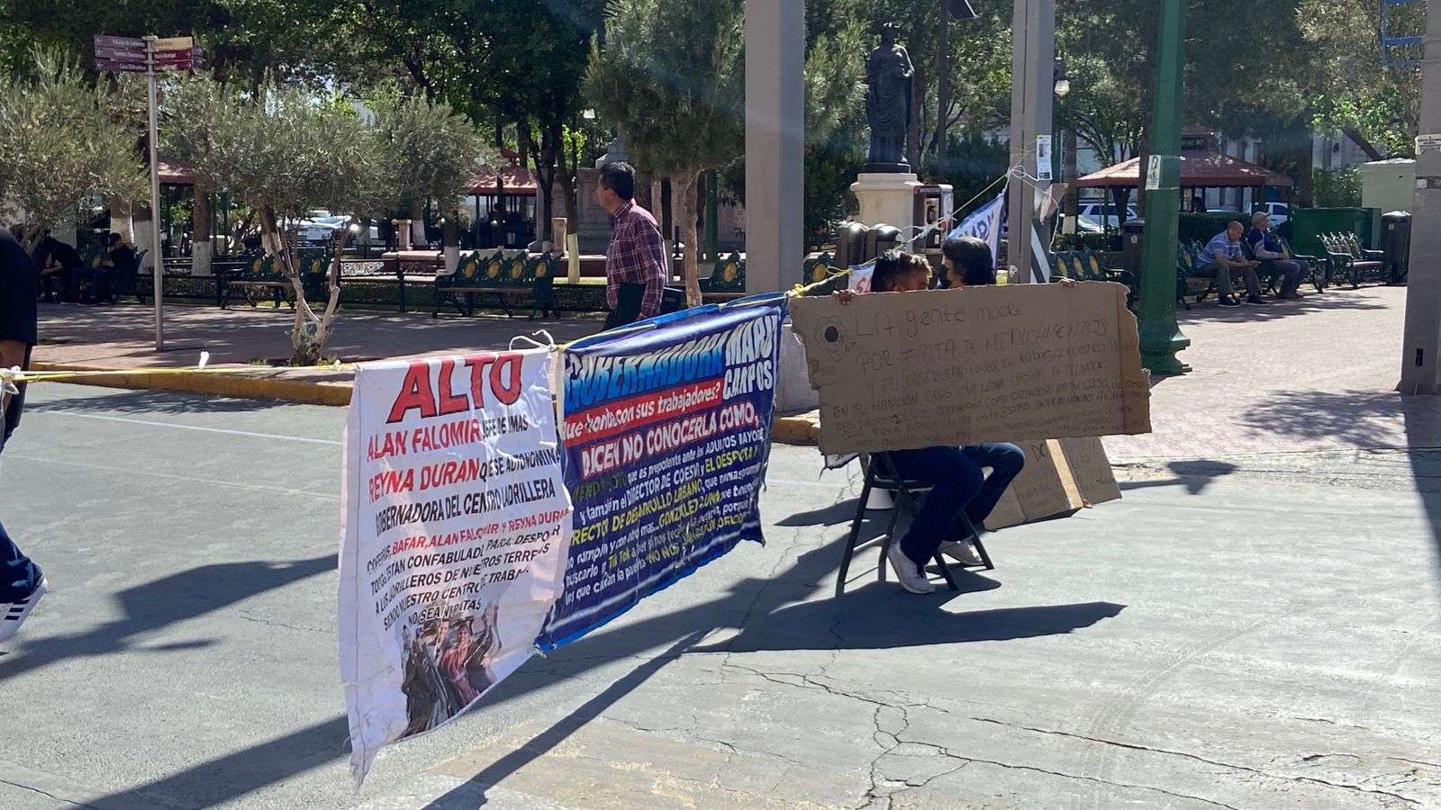 Ayudados con pancartas hechas de cartón exigen a las autoridades estatales la inmediata dotación de fármacos controlados que a decir de ellos no se encuentran disponibles en las farmacias de MediChihuahua.