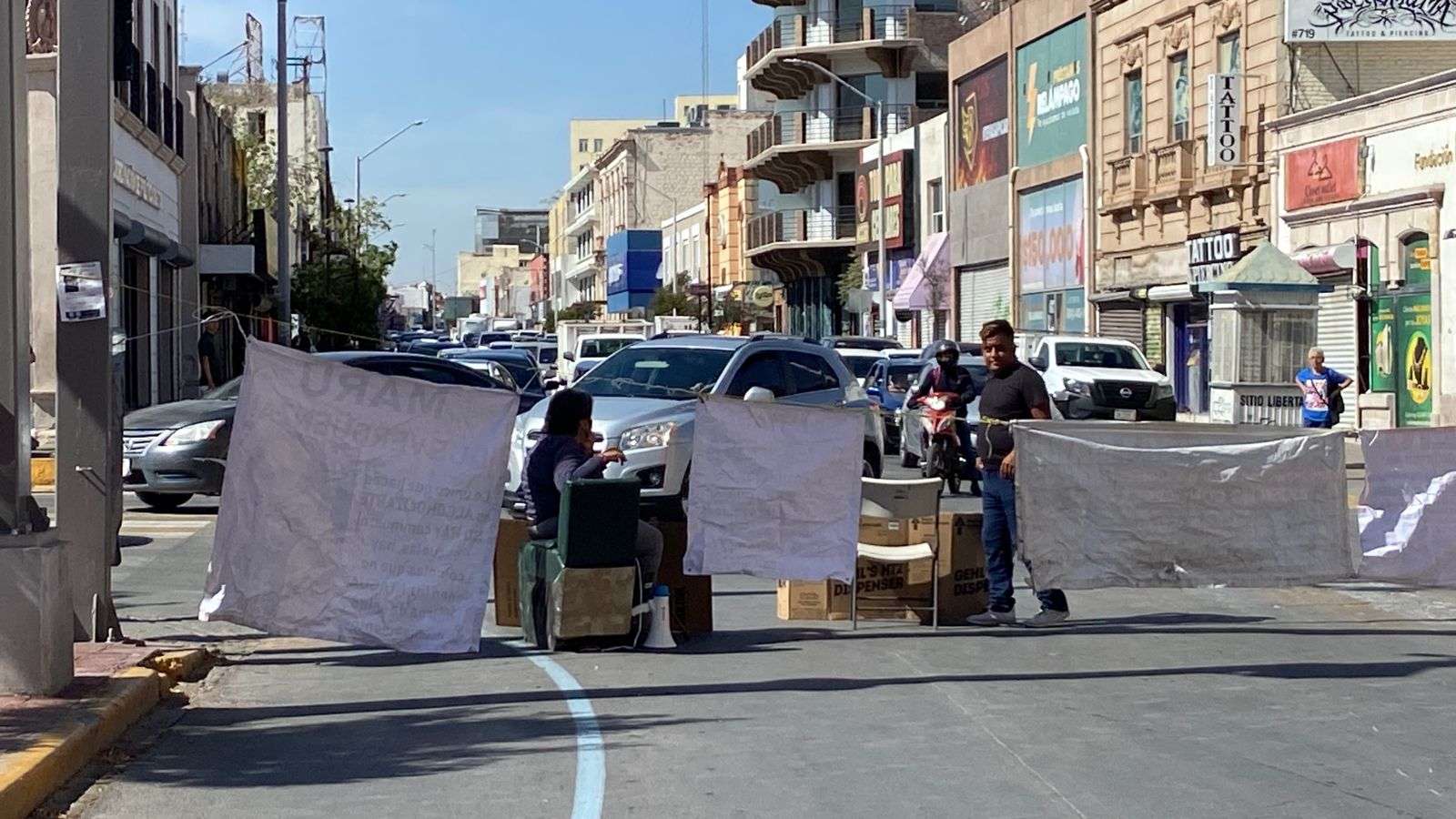 Ayudados por lonas y una camioneta cerraron la calle Aldama a la altura de la calle Vicente Guerrero, por lo que se está haciendo un gran congestionamiento vial.