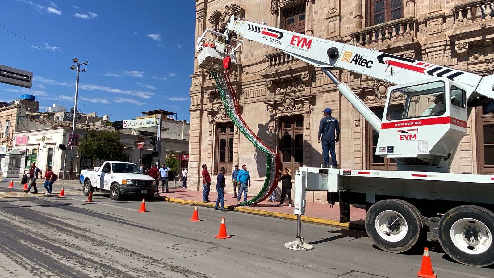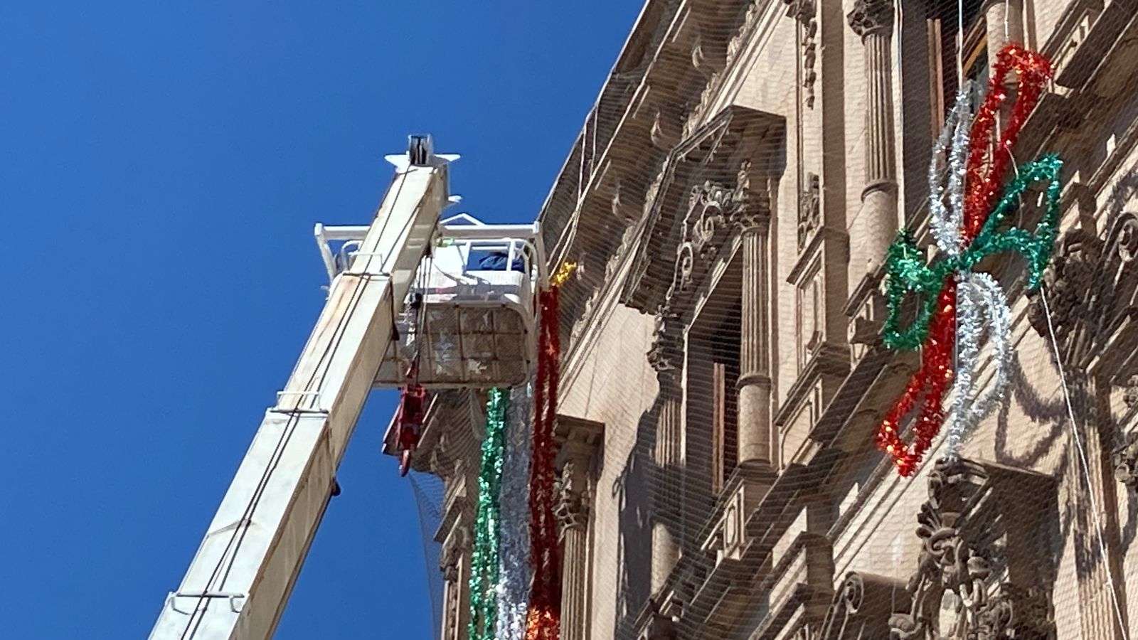 Chihuahua.- Trabajadores del Gobierno del Estado, iniciaron el retiro de los adornos patrios que engalanaron el Palacio de Gobierno durante la celebración del CCXV Aniversario de la Independencia de México, por lo que fue necesario cerrar un carril de la calle Aldama.