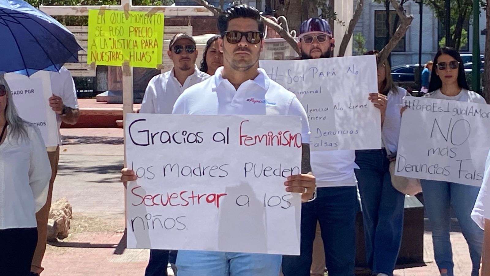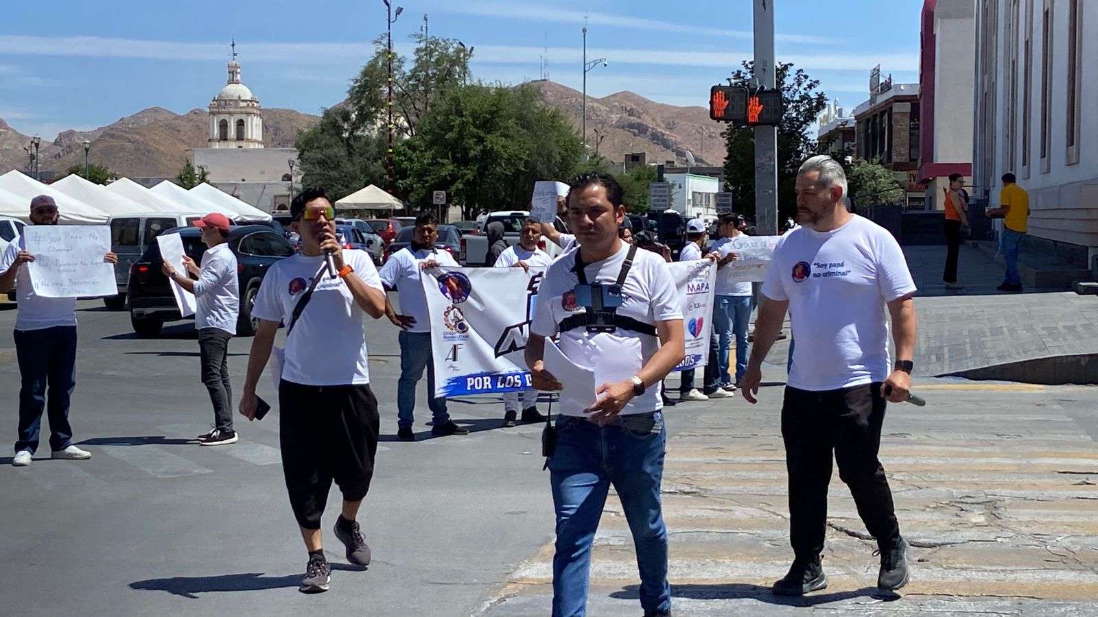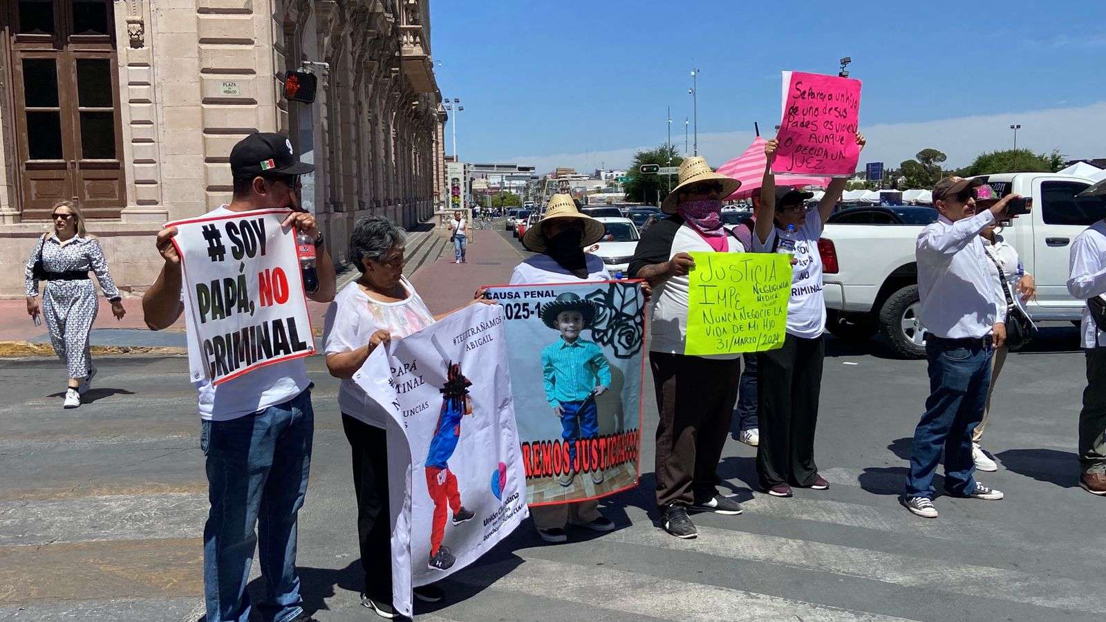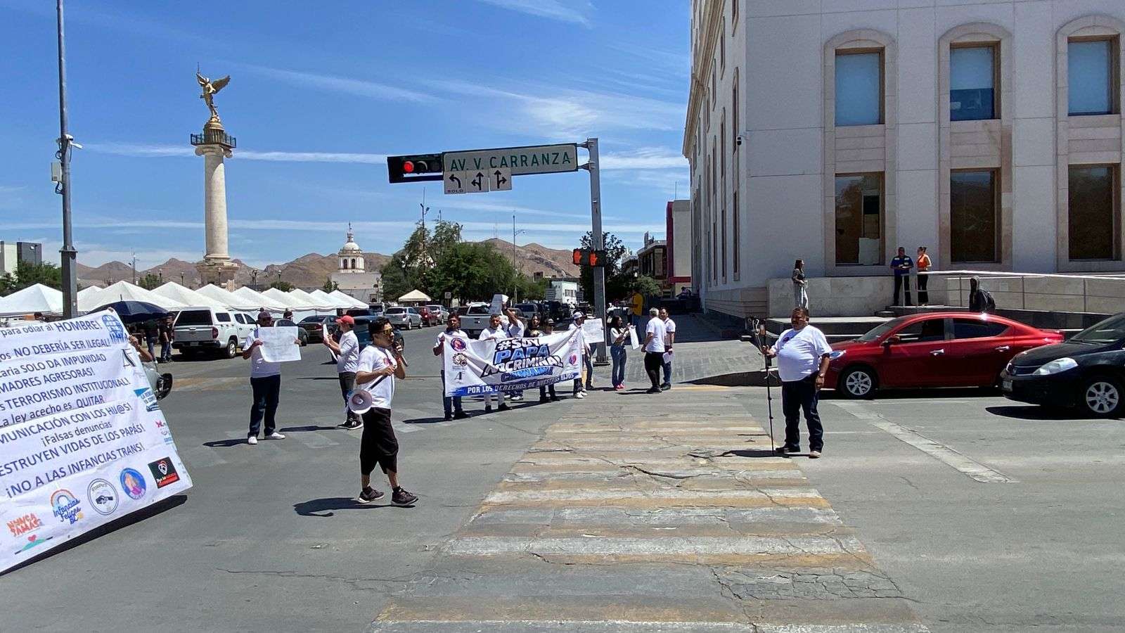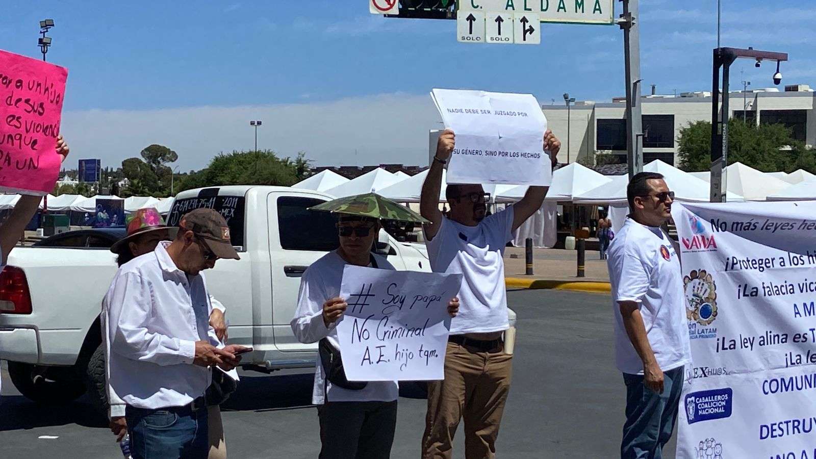 Con pancartas y lonas que decían "No más leyes hechas para odiar al hombre", "La falacia Vicaría solo da impunidad a madres agresoras", "La ley acecho es quitar comunicación con los y las hijas", cerraron las avenida Carranza y Aldama.