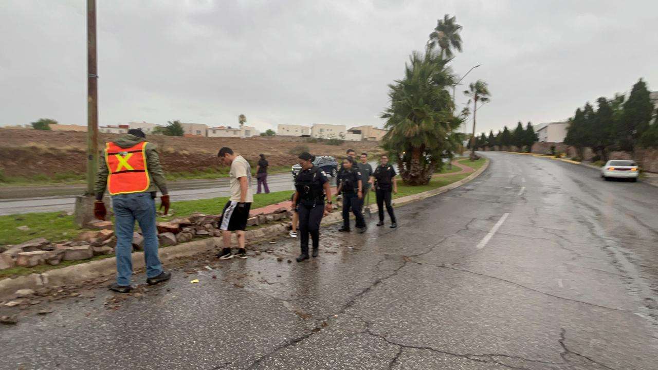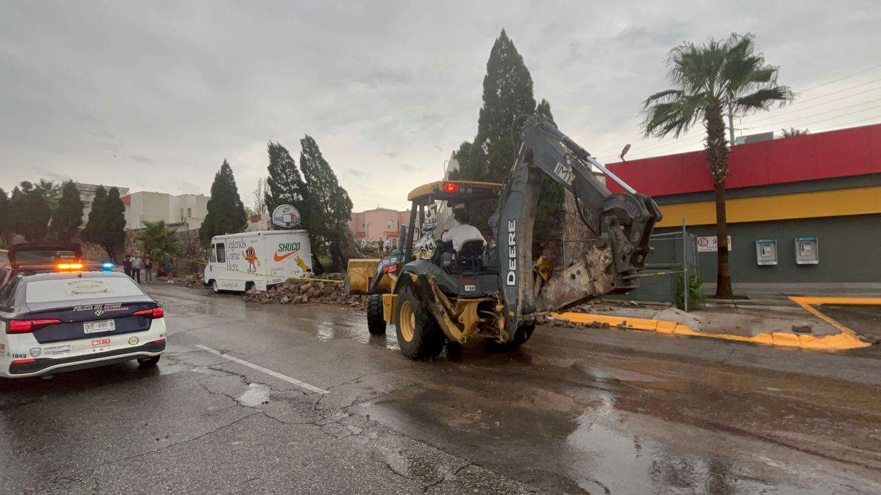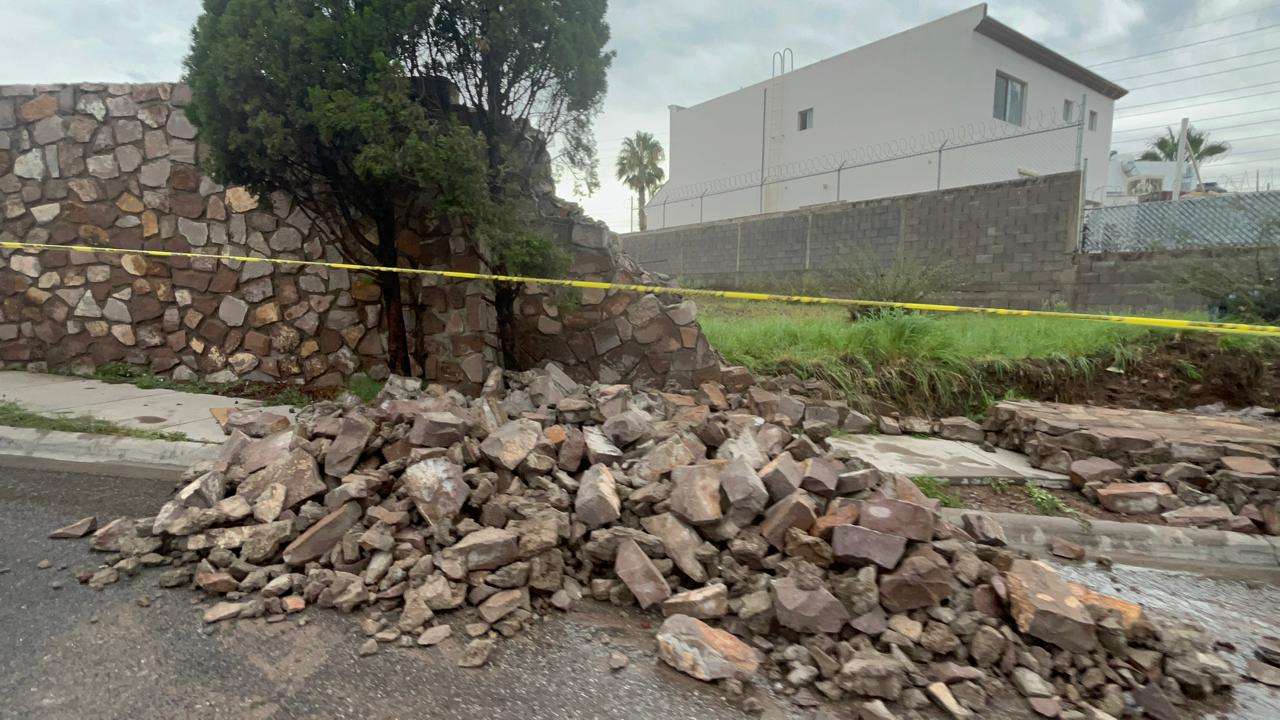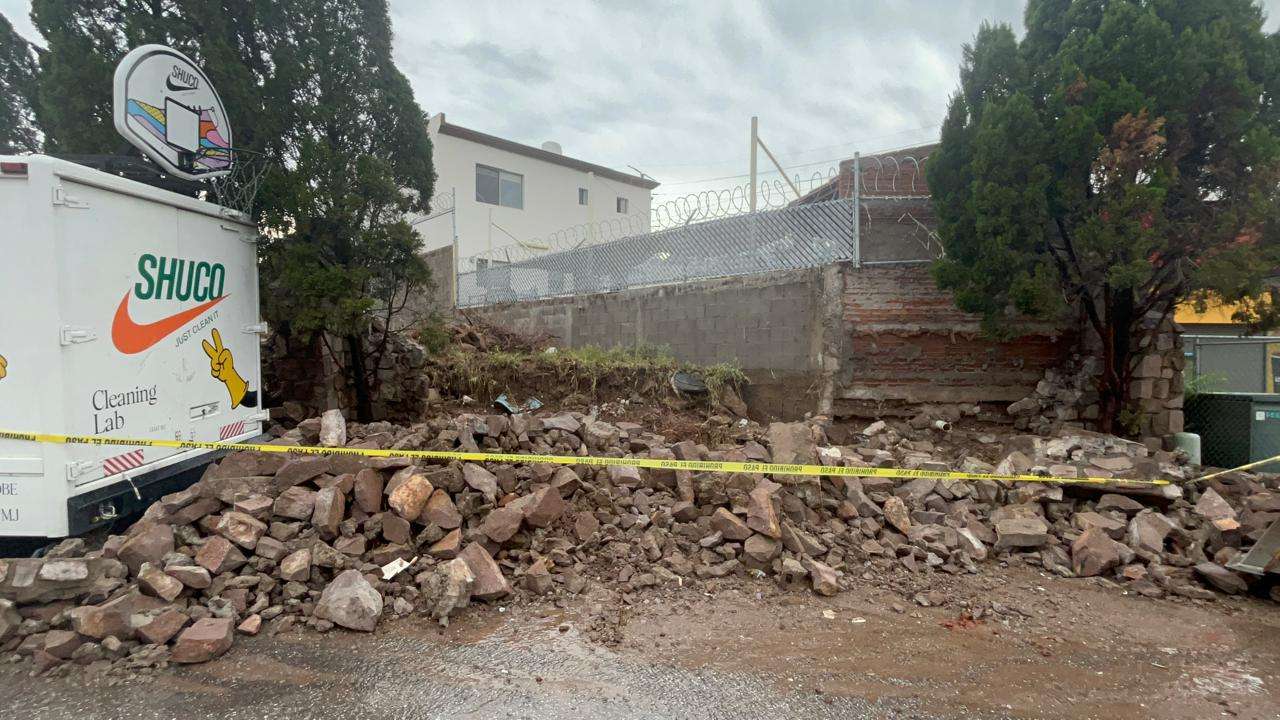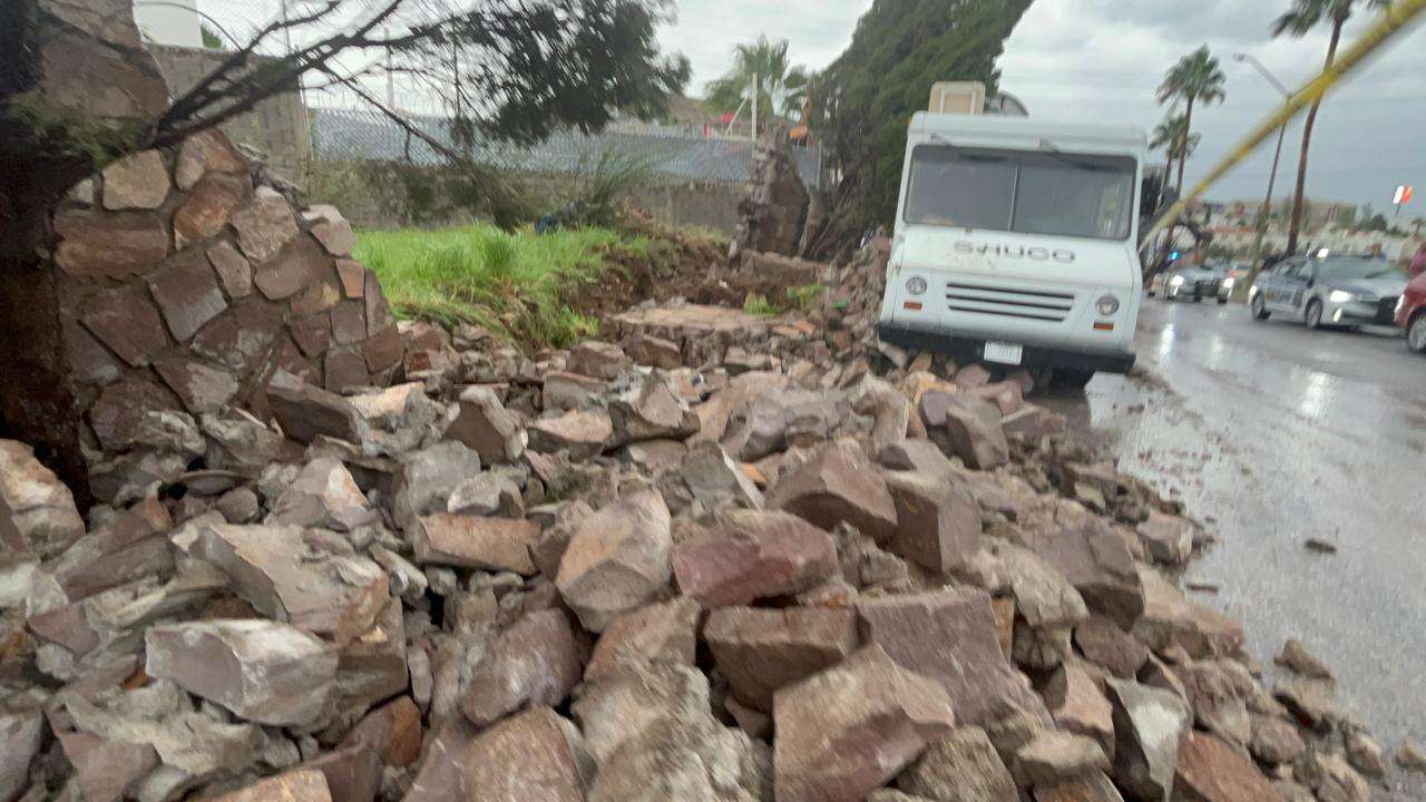 Chihuahua.- Debido a la fuerte tormenta que cayó en la ciudad, una barda de piedra cayó sobre la avenida Tomás Valles.