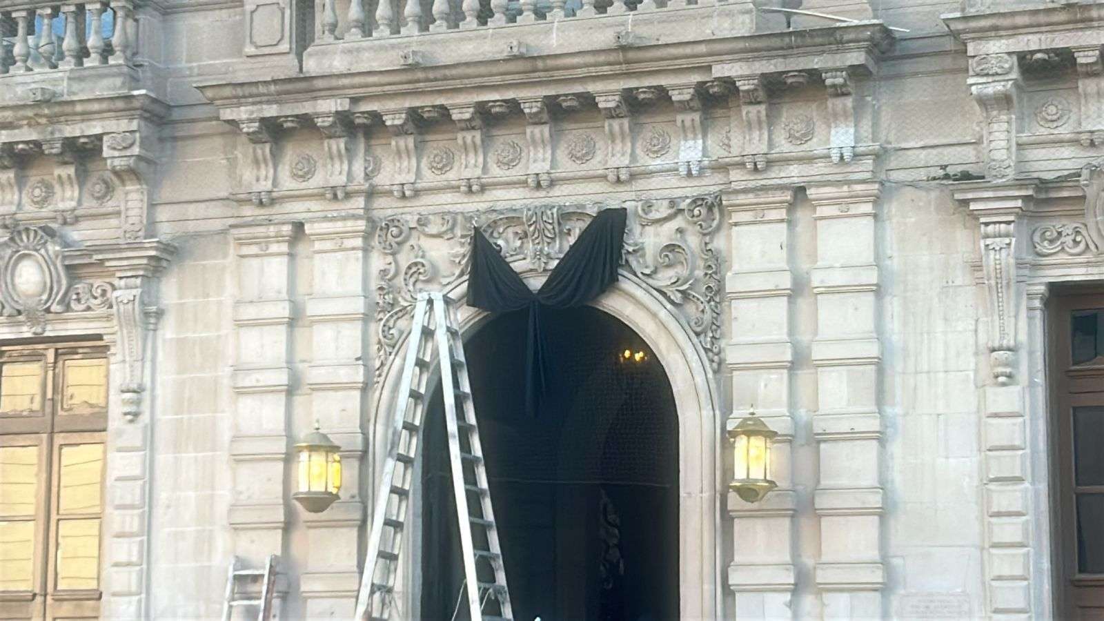 En ambas entradas la de la Libertad y la de Aldama se pueden apreciar los moños negros que cubren la parte superior de las puertas del edificio de cantera.