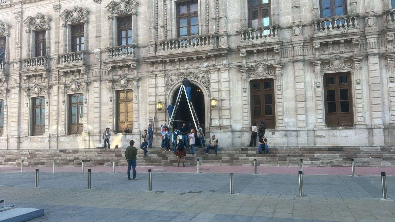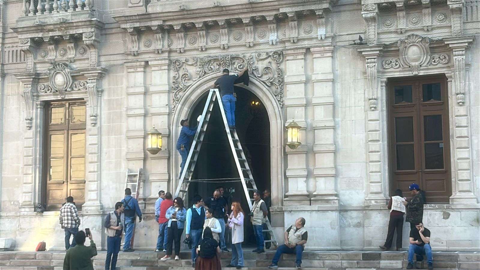 Los moños fueron instalados por trabajadores del Gobierno del Estado, quienes, con ayuda de una escalera, los colocaron en las entradas principales ubicadas sobre las calles Aldama y Libertad.