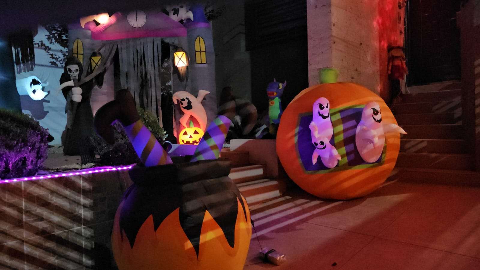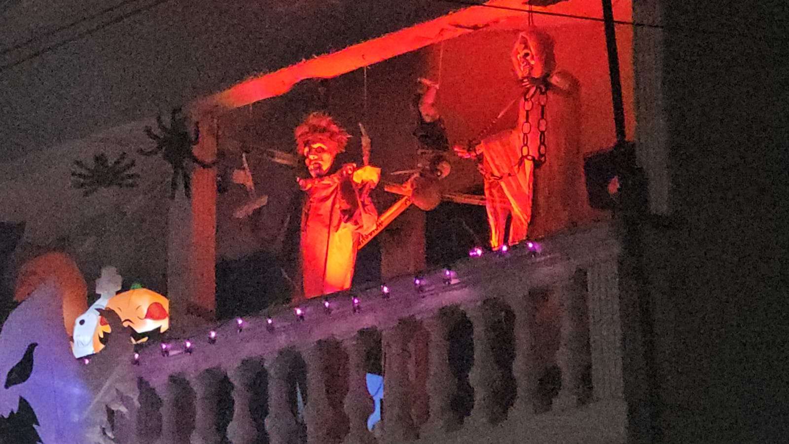 En distintos domicilios pueden observarse muñecos inflables, calabazas, telarañas falsas y figuras terroríficas que llenan de ambiente festivo las calles del sector.