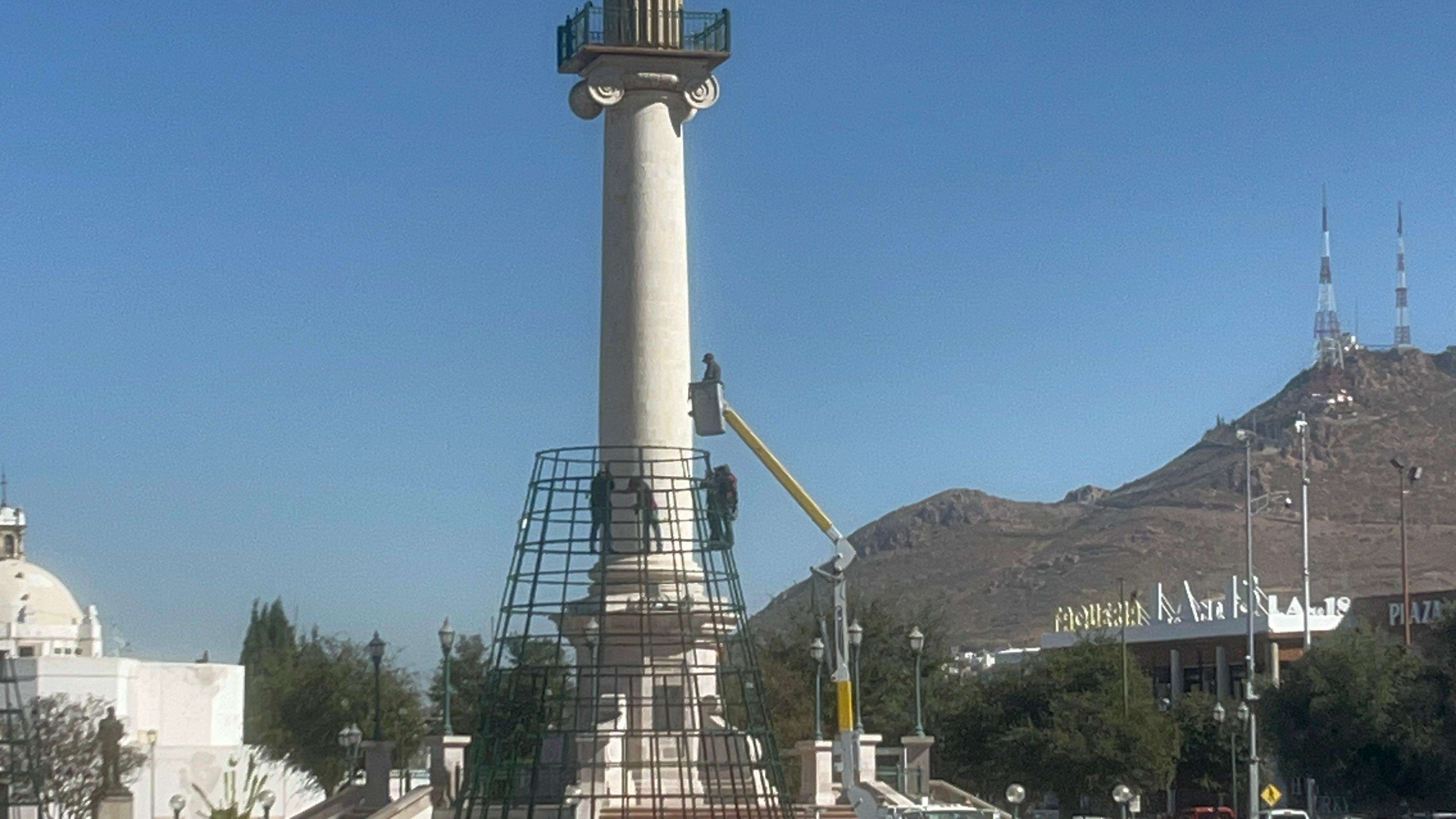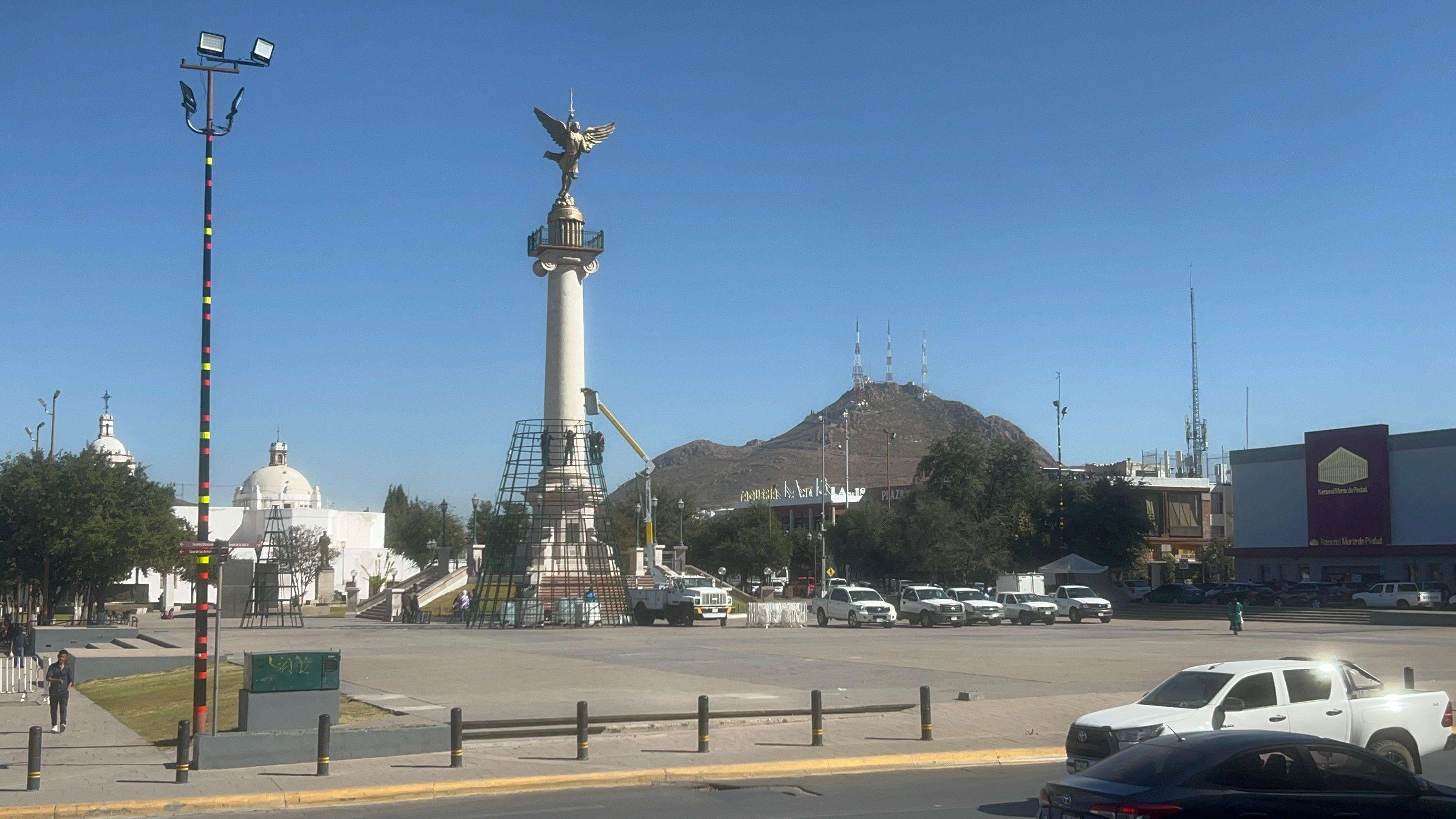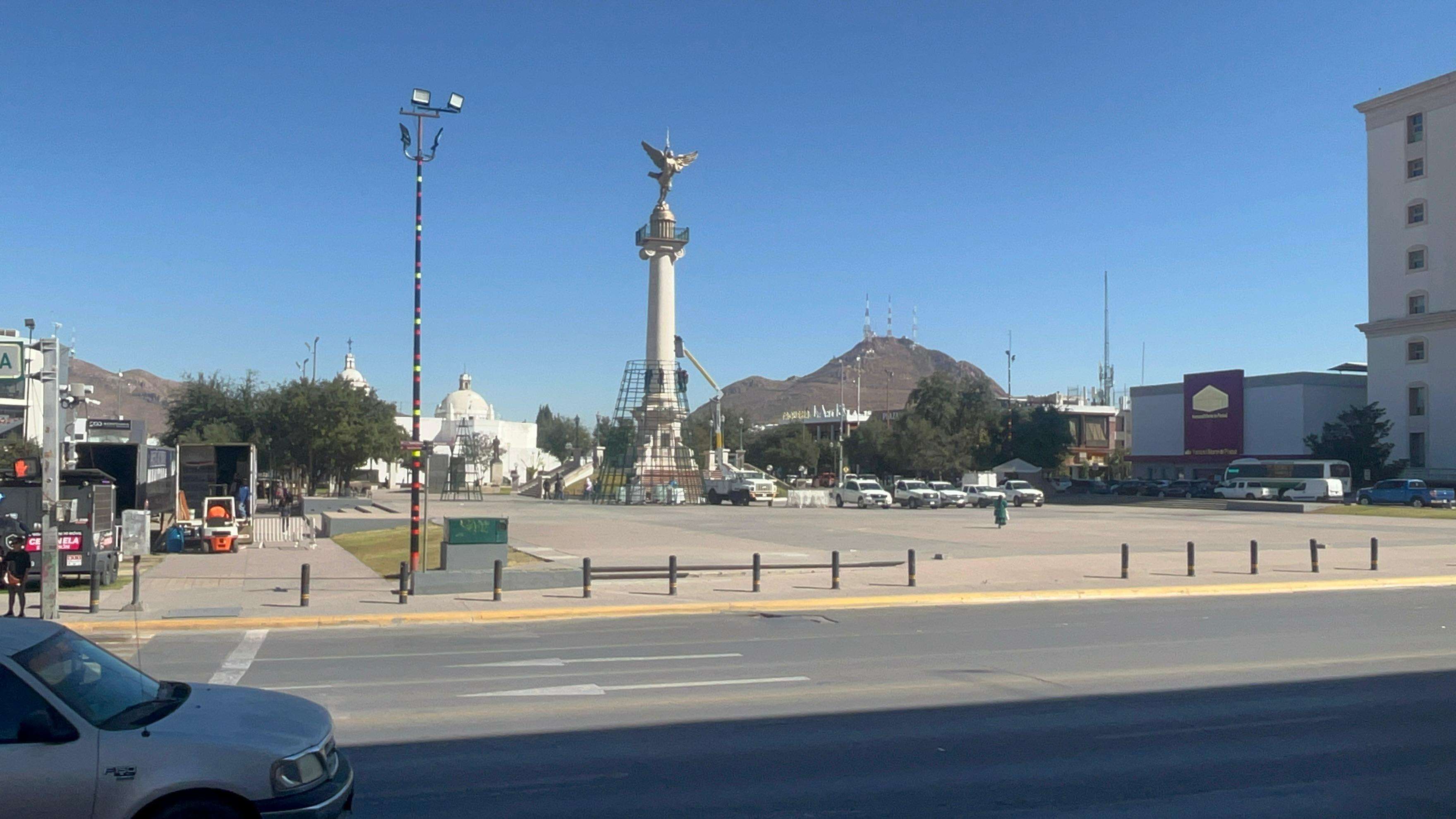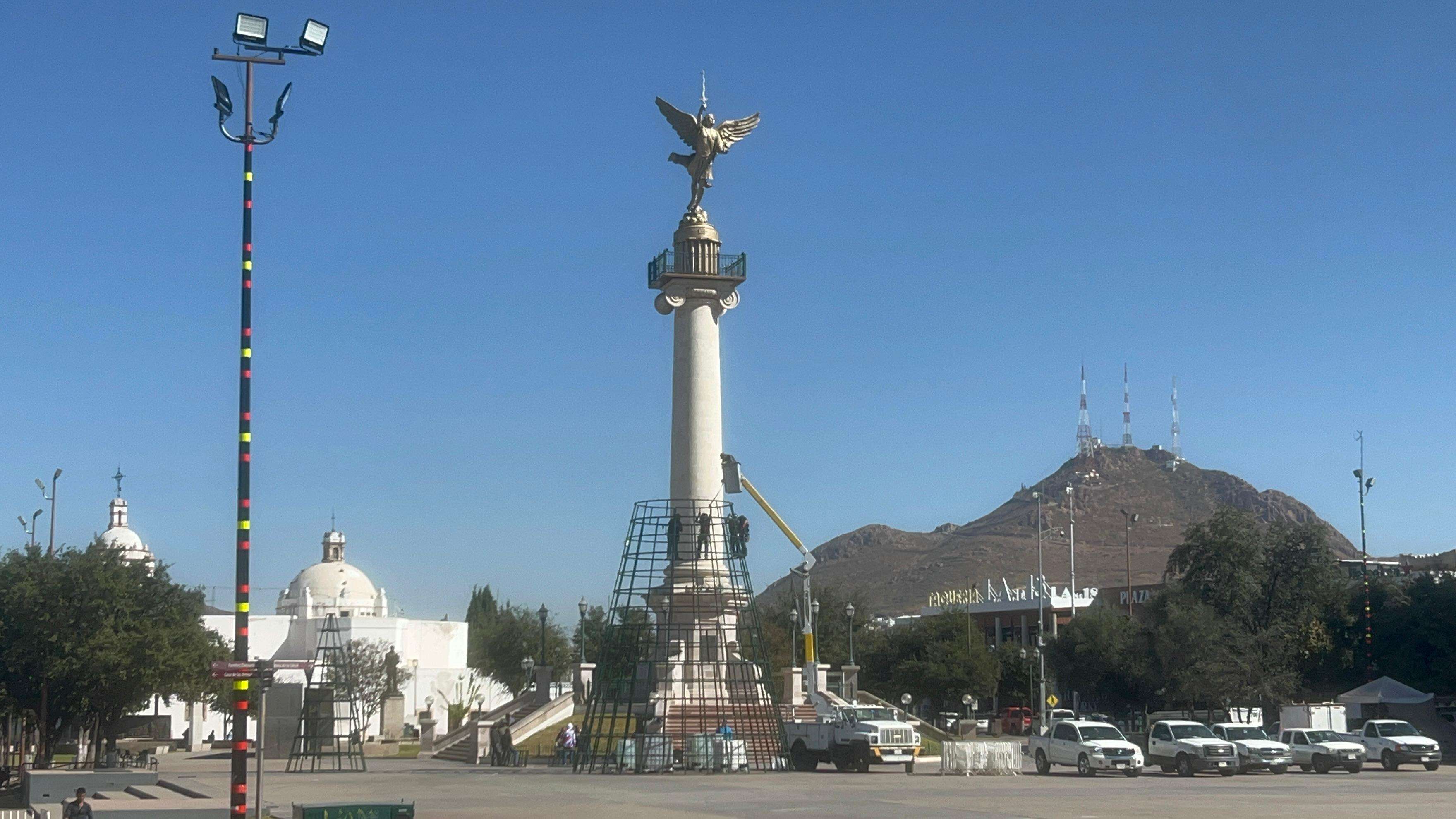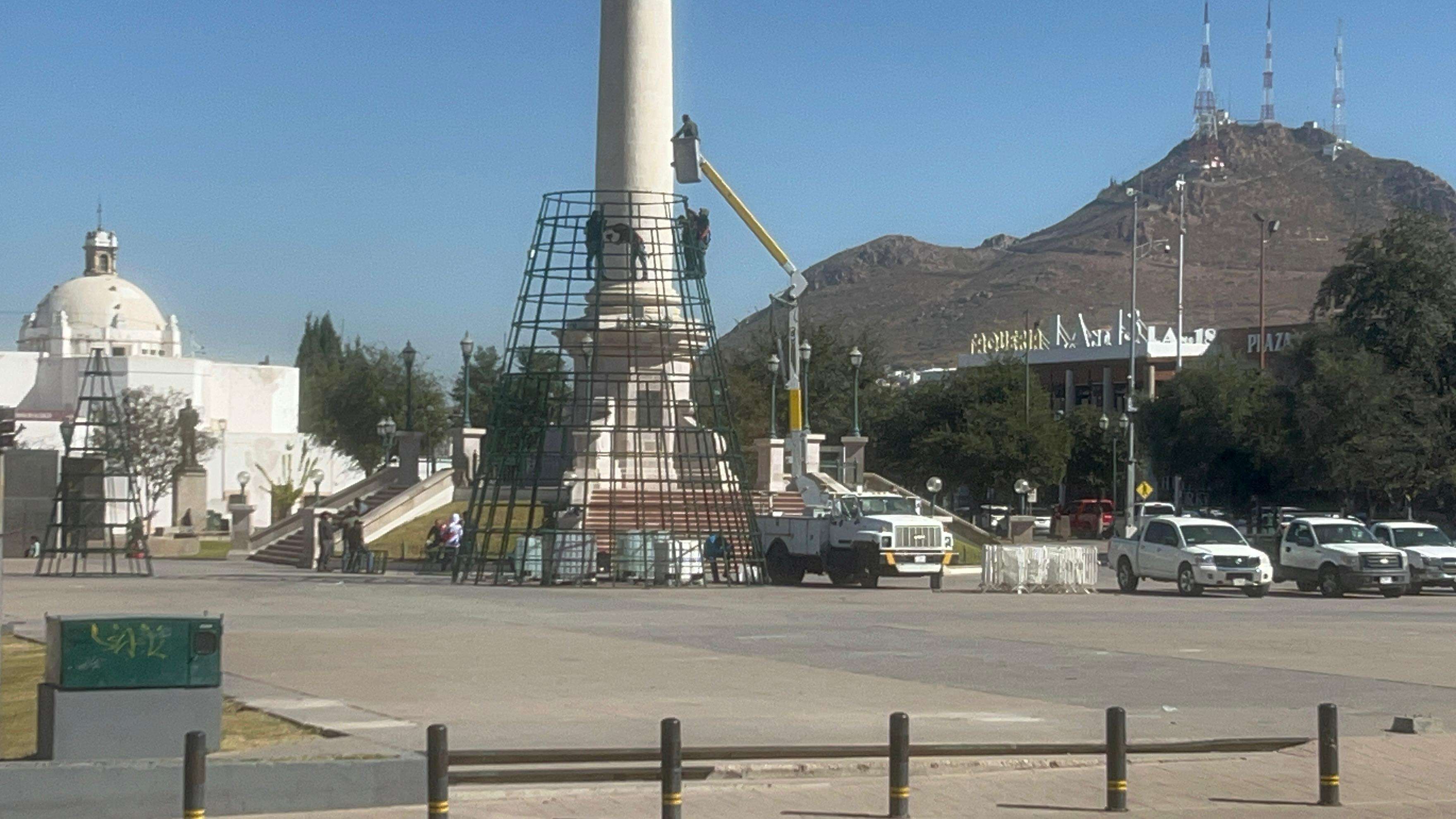 Chihuahua.- Empleados del Gobierno del Estado de Chihuahua dieron inicio a los trabajos para la instalación del tradicional árbol navideño en la Plaza del Ángel, justo frente al Palacio de Gobierno.