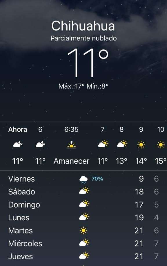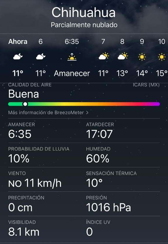 Chihuahua.- Al inicio del día se percibieron vientos de 11 km/h, sin embargo, por la tarde se prevén que los vientos aumenten de 21 a 40 kilómetros por hora y probabilidad de lluvias del 10%.
