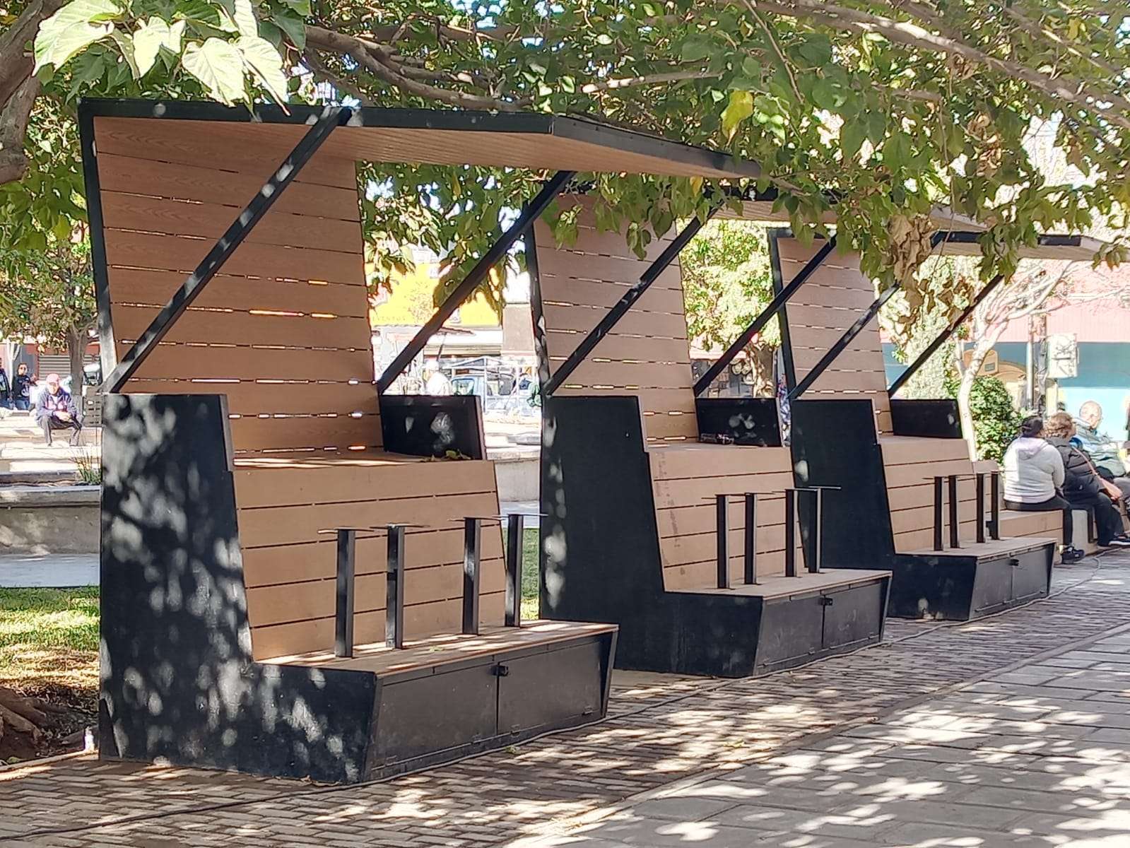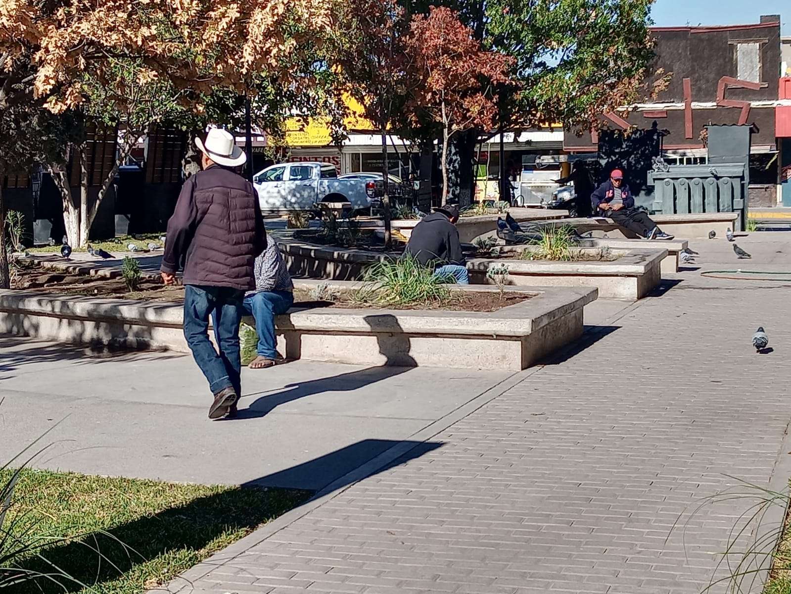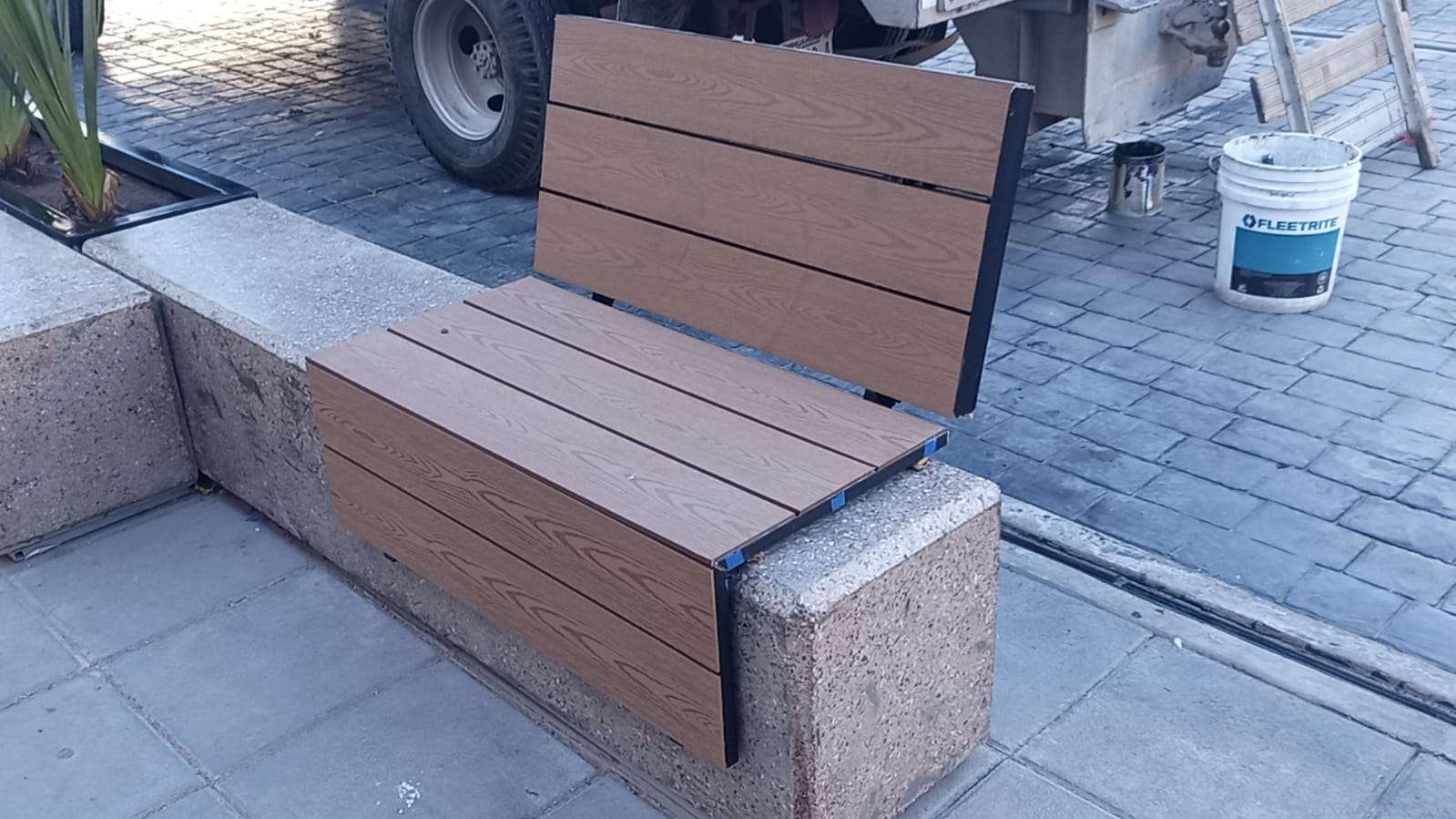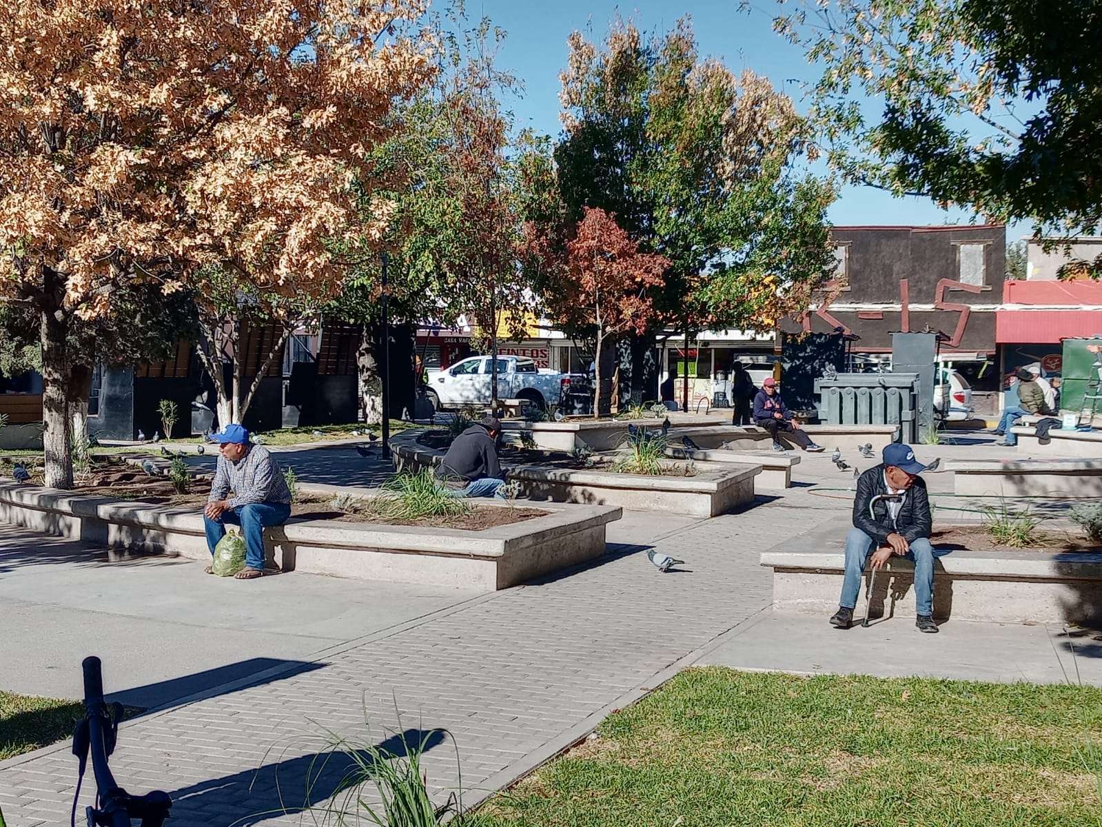 En la plaza merino se colocaron jardineras nuevas con plantas de ornamento y pasto en todo su alrededor, así como los módulos de los boleros que ya se rehabilitaron y son ahora más grandes hechos de madera y acero.