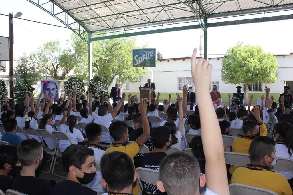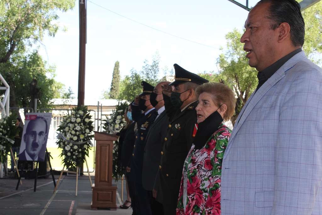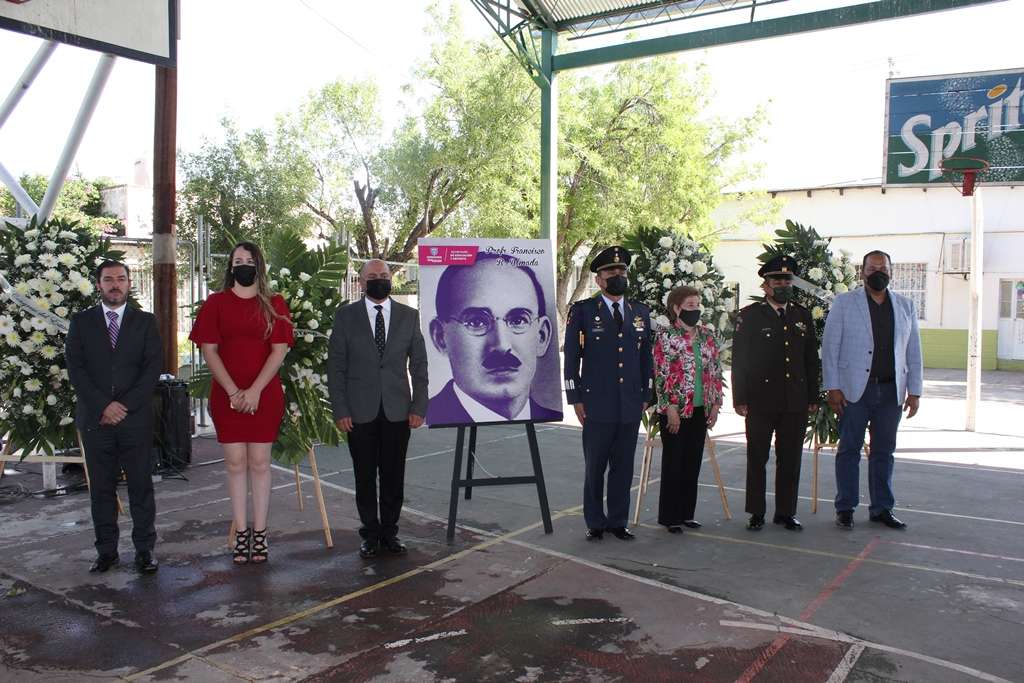 El acto conmemorativo se realizó en la Escuela Primaria Estatal “Francisco R. Almada”, de la colonia Rosario, encabezado por autoridades estatales, educativas, militares, familiares del homenajeado y alumnos del plantel escolar.