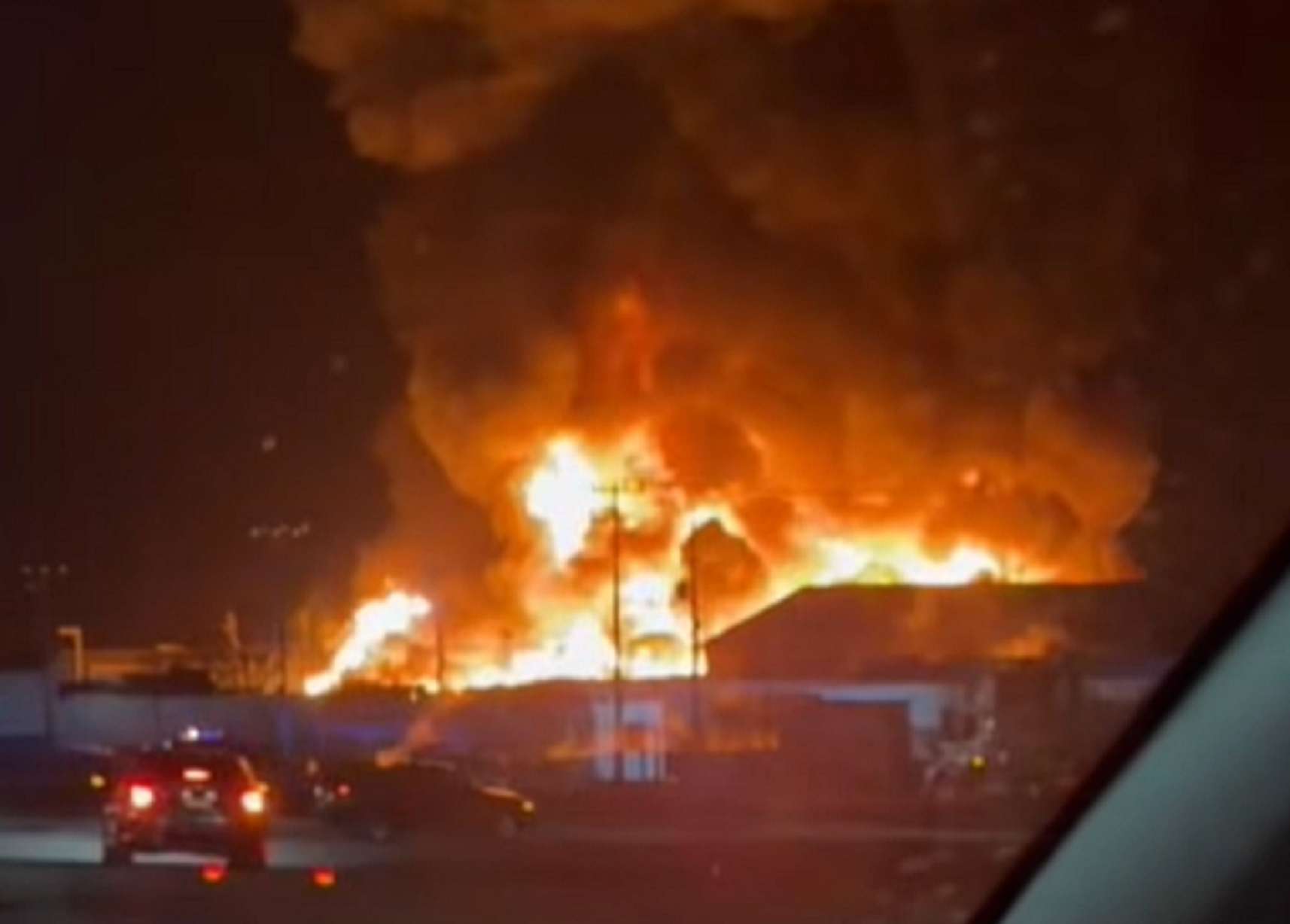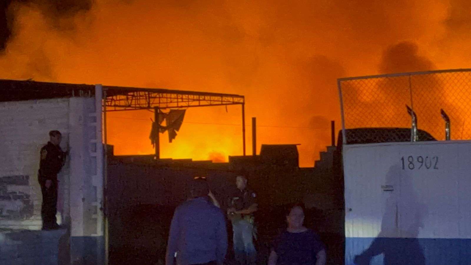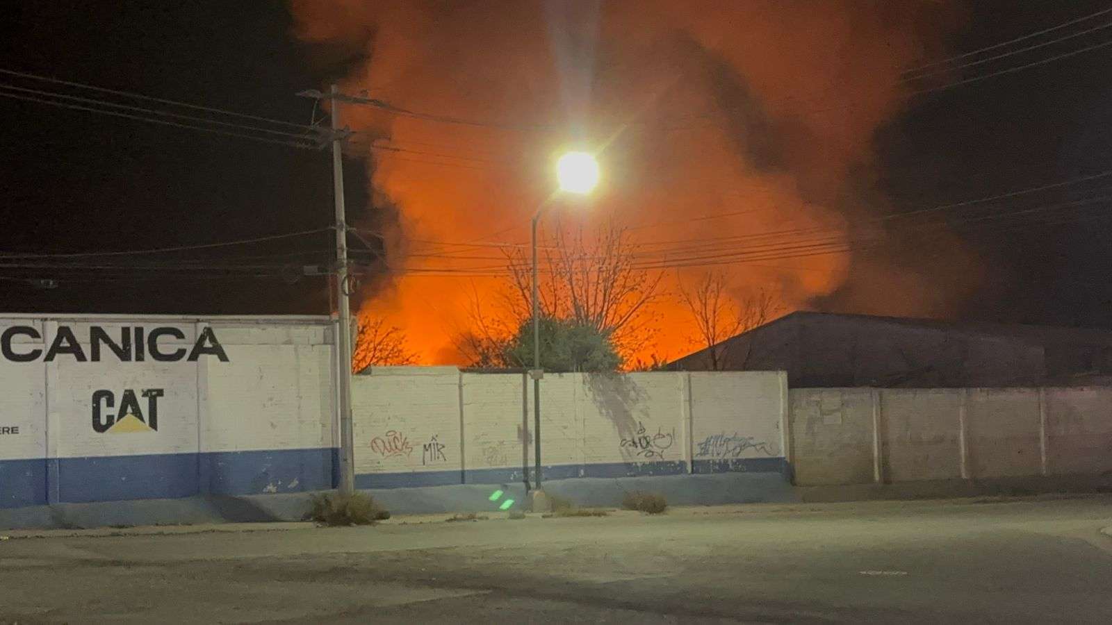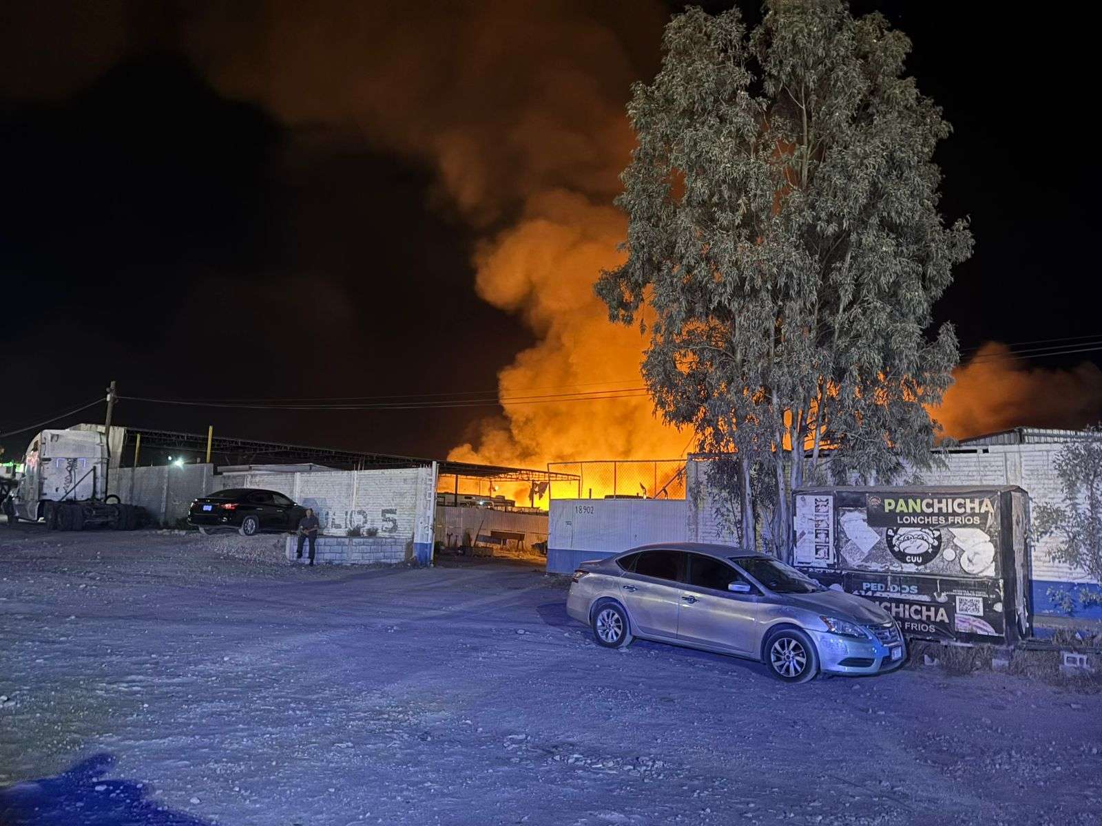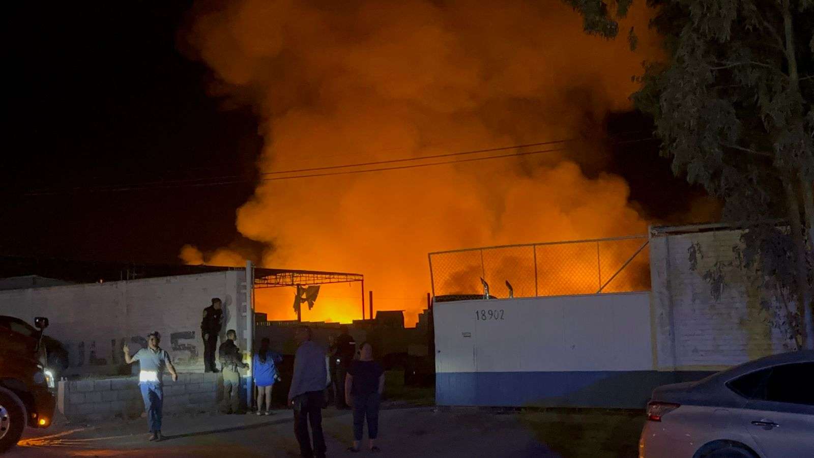 Chihuahua, Chih.- Un voraz incendio registrado la noche de este viernes consumió una fábrica de tarimas ubicada al norte de la ciudad, generando una intensa movilización de los cuerpos de emergencia ante el riesgo inminente de que las llamas alcanzaran una gasolinera contigua.