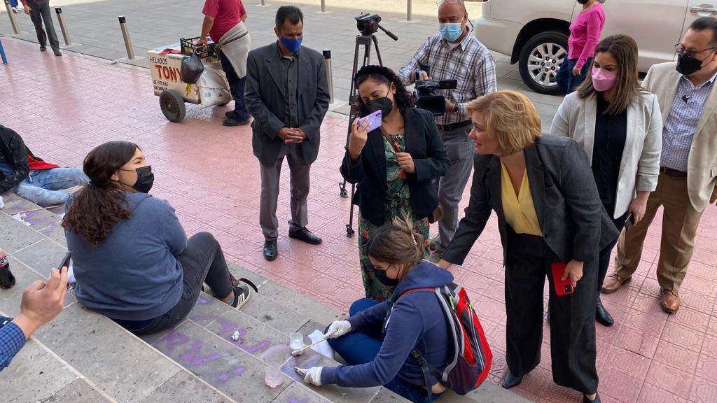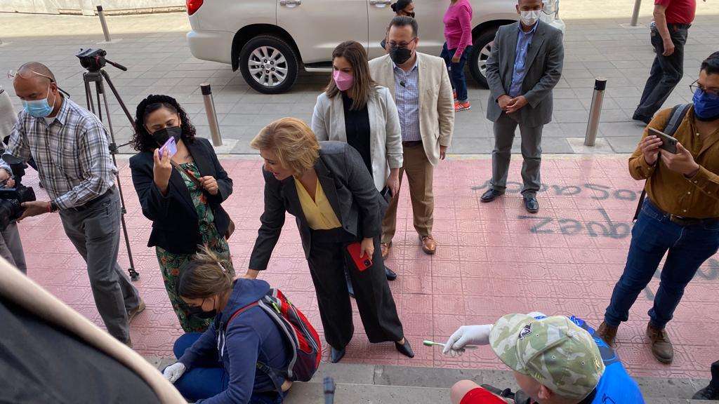 Chihuahua.- La Gobernadora del Estado, Maru Campos Galván, suspendió por unos breves minutos su agenda para conversar con los trabajadores que retiraron durante la mañana las pintas de la fachada de Palacio de Gobierno.