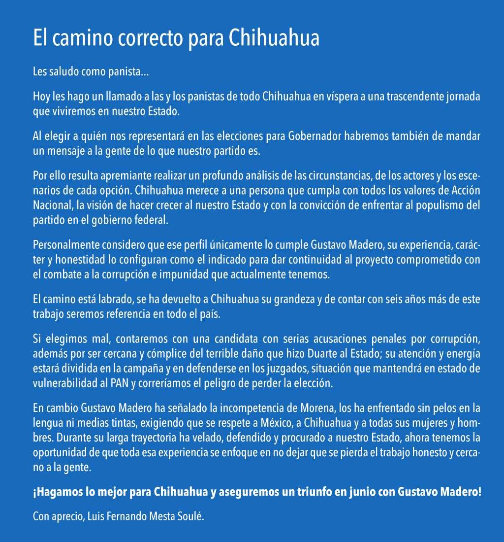 “Gustavo Madero ha señalado la incompetencia de Morena, los ha enfrentado sin pelos en la lengua ni medias tintas, exigiendo que se respete a México, a Chihuahua y a todas las mujeres y hombres”, sentenció.